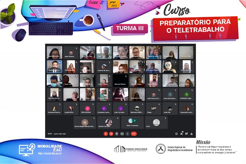Teve início, nesta terça-feira (22/2), a terceira turma do Curso Preparatório para o Teletrabalho, na modalidade à distância, ao vivo pela Plataforma Google Meet. Realizado pela Escola Superior da Magistratura Tocantinense (ESMAT), o curso possui carga horária de 20 horas e se estende até o dia 8 de março deste ano.