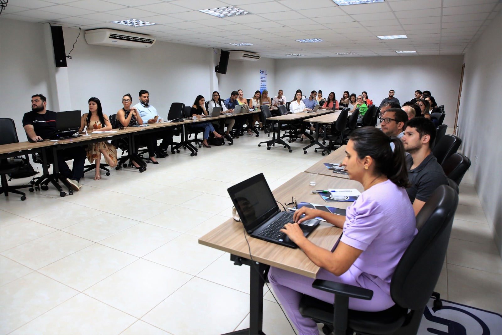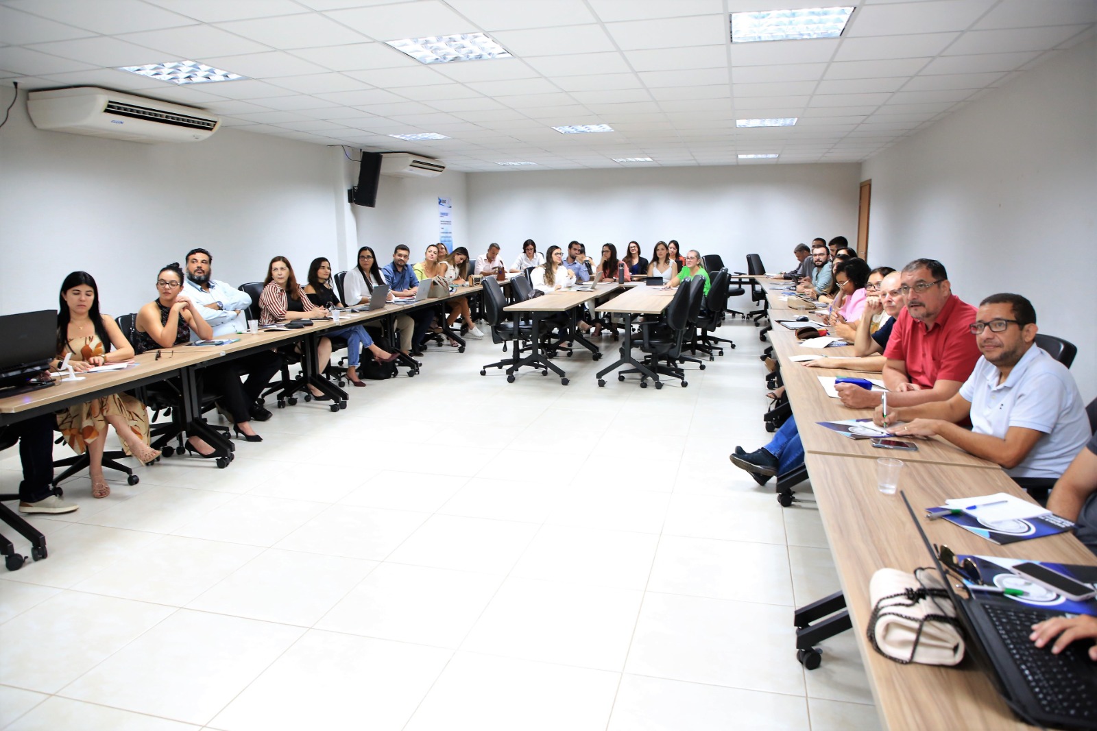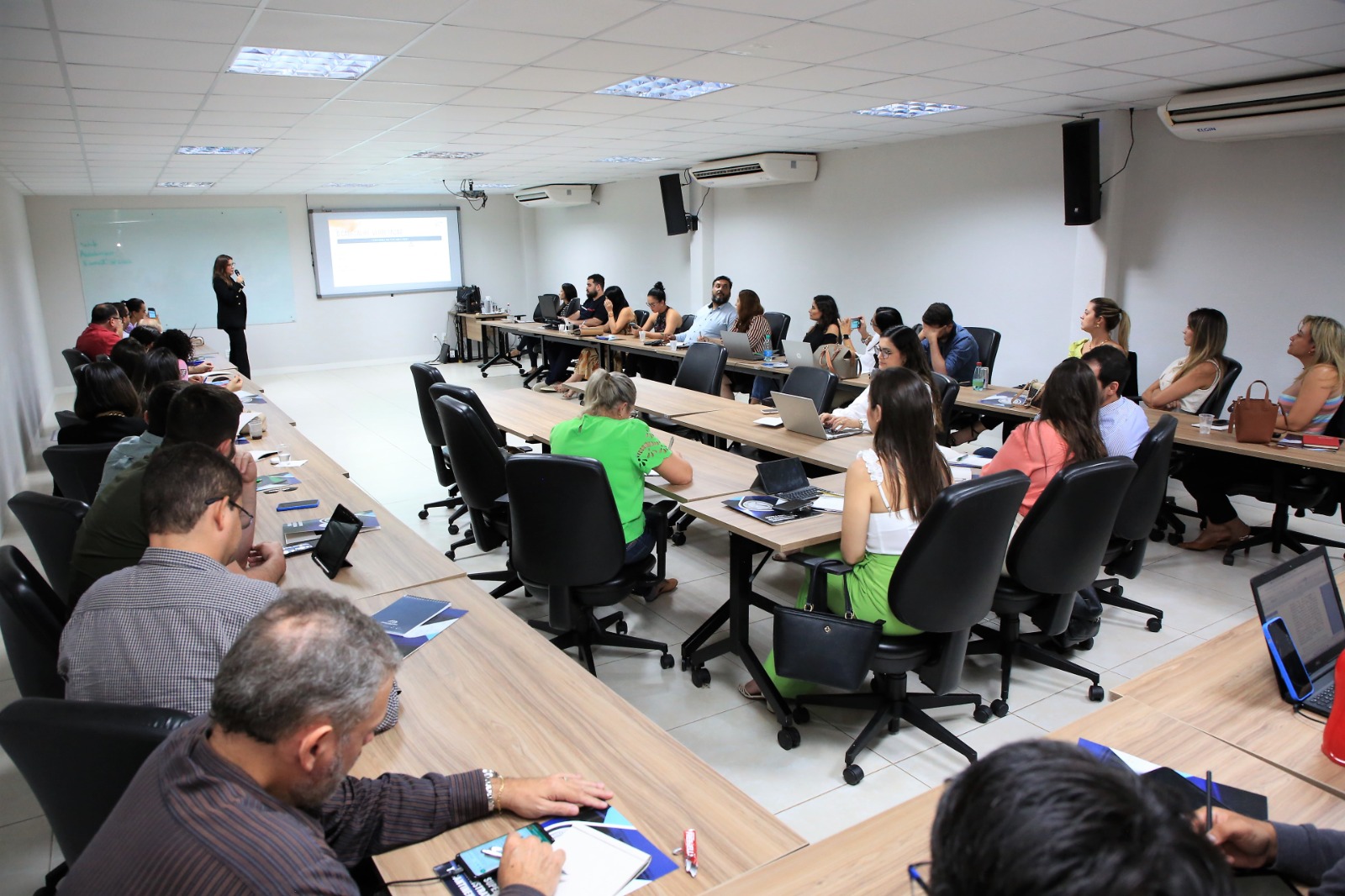 Foto: Hodirley Canguçu A imagem nesta página é um fotografia da turma do Curso de Elaboração de Minutas de Ementas. Os alunos estão sentados e atentos ao que está sendo discutido.