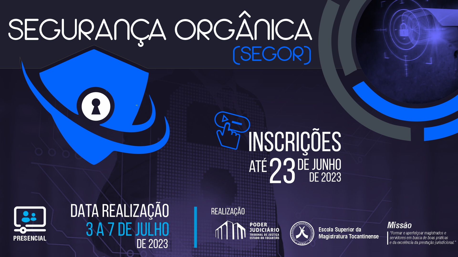 As inscrições para o curso Segurança Orgânica (SEGOR) estão abertas e serão realizadas pela Secretaria da Esmat no Sistema Acadêmico da Escola (SAV/ESMAT), de acordo com as indicações do Núcleo de Inteligência e Segurança Institucional (NIS), por meio do Processo SEI nº 23.0.000009585-0.