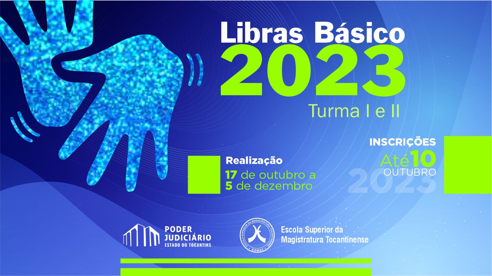 A Escola Superior da Magistratura Tocantinense (ESMAT) está com inscrições abertas para o curso de Libras Básico, que será realizado em duas turmas, Turma I (matutino) e Turma II (vespertino), no período de 17 de outubro a 5 de dezembro de 2023. O curso será desenvolvido de forma virtual, por meio da plataforma virtual da Escola.