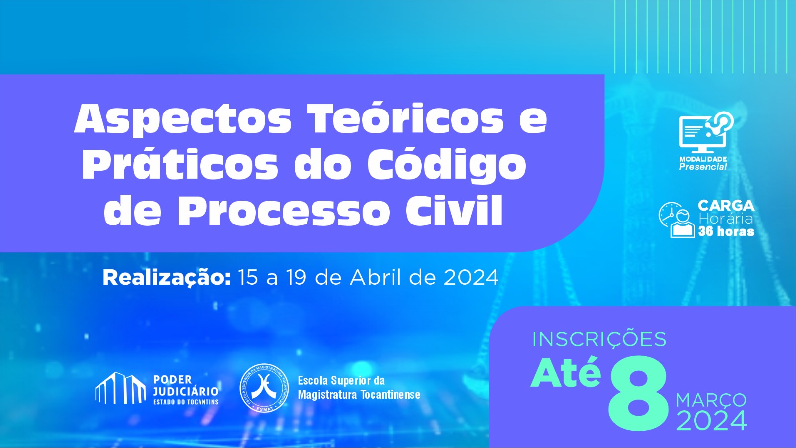 A Escola Superior da Magistratura Tocantinense (ESMAT) abre, nesta terça-feira (5/3), as inscrições para o curso “Aspectos Teóricos e Práticos do Código de Processo Civil”. A capacitação conta com uma carga horária de 36 horas e será desenvolvida no período de 15 a 19 de abril, de forma presencial, na Esmat.