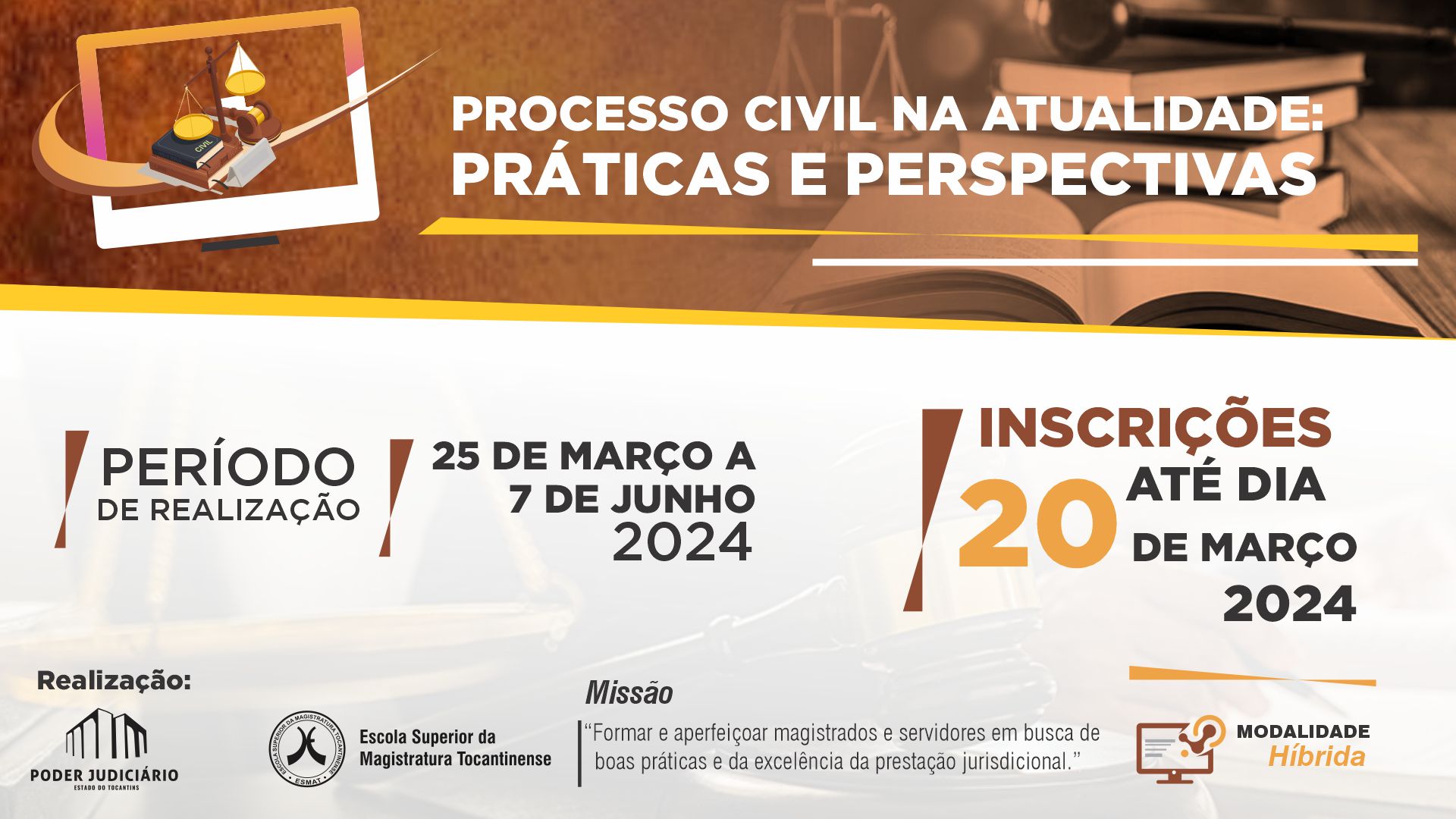 Estão abertas as inscrições para o curso “Processo Civil na Atualidade: práticas e perspectivas”. Desenvolvida pela Escola Superior da Magistratura Tocantinense (ESMAT), a capacitação contará com uma carga horária de 70 horas e será desenvolvida no período de 25 de março a 7 de junho, de forma híbrida.