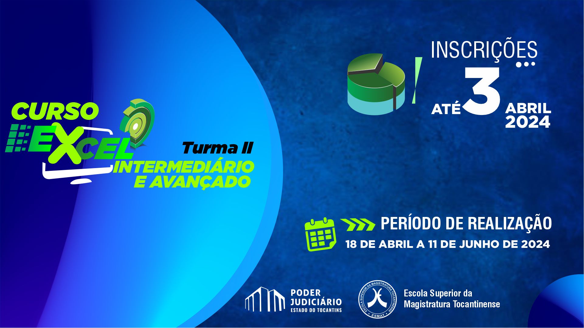 A Escola Superior da Magistratura Tocantinense (Esmat) abriu as inscrições para os(as) servidores(as) do Poder Judiciário interessados(as) em participar da turma II do curso “Excel Intermediário e Avançado”. As atividades ocorrerão no período de 18 de abril a 11 de junho, de forma virtual. Ao todo serão realizadas vinte webaulas ministradas pelo facilitador Ronan Lopes da Silva.