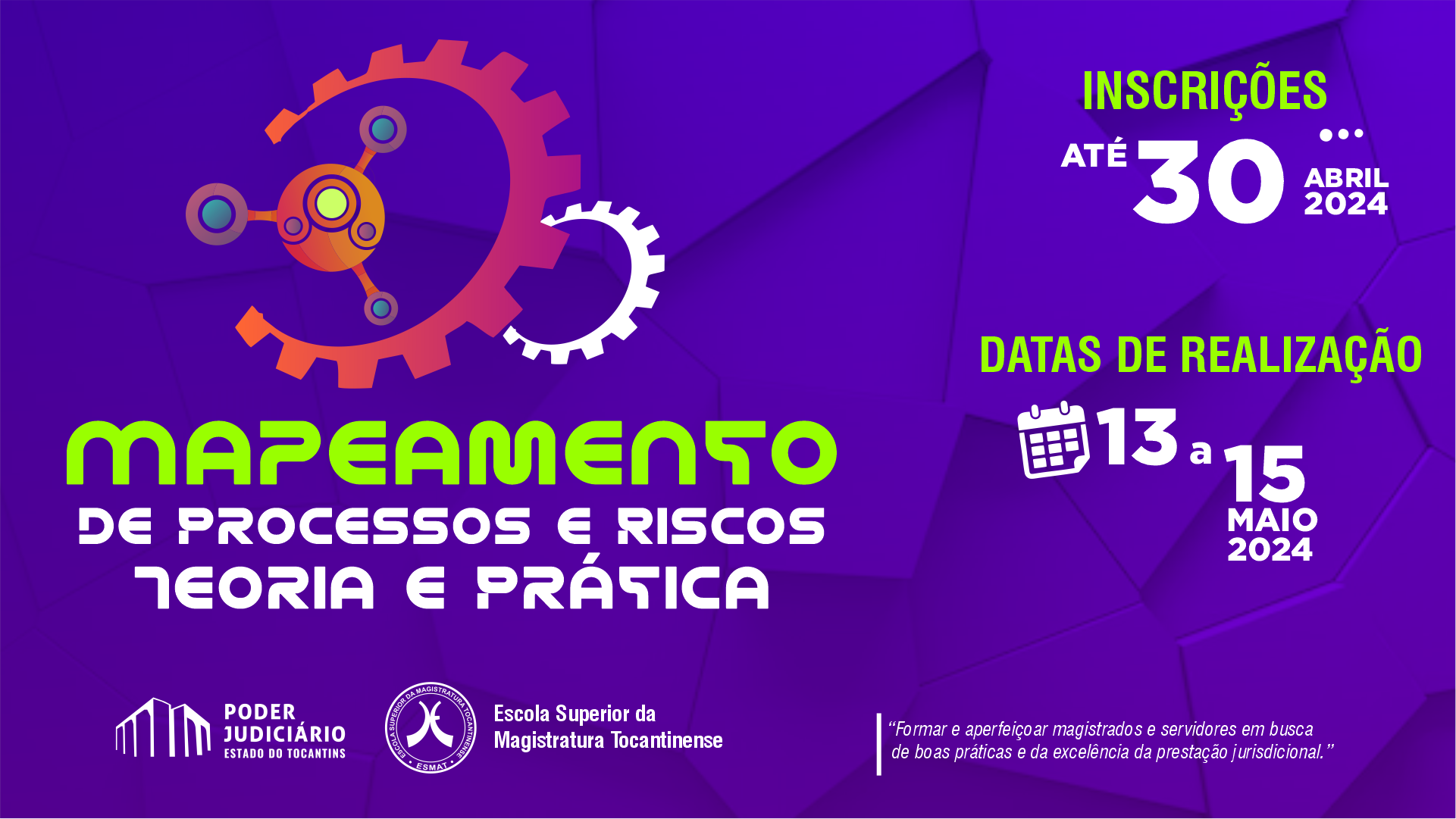 Com o objetivo de capacitar servidores(as) do Poder Judiciário para mapear os processos utilizando a notação BPMN 2.0, a Escola Superior da Magistratura Tocantinense (Esmat) realizará, no período de 13 a 15 de maio, o curso Mapeamento de Processos e Riscos – Teoria e Prática – para auxiliar na identificação dos riscos presentes e modelar os processos inserindo melhorias com base nos riscos identificados, conforme metodologia estabelecida no Manual de Gestão de Riscos do Tribunal de Justiça do Estado do Tocantins.