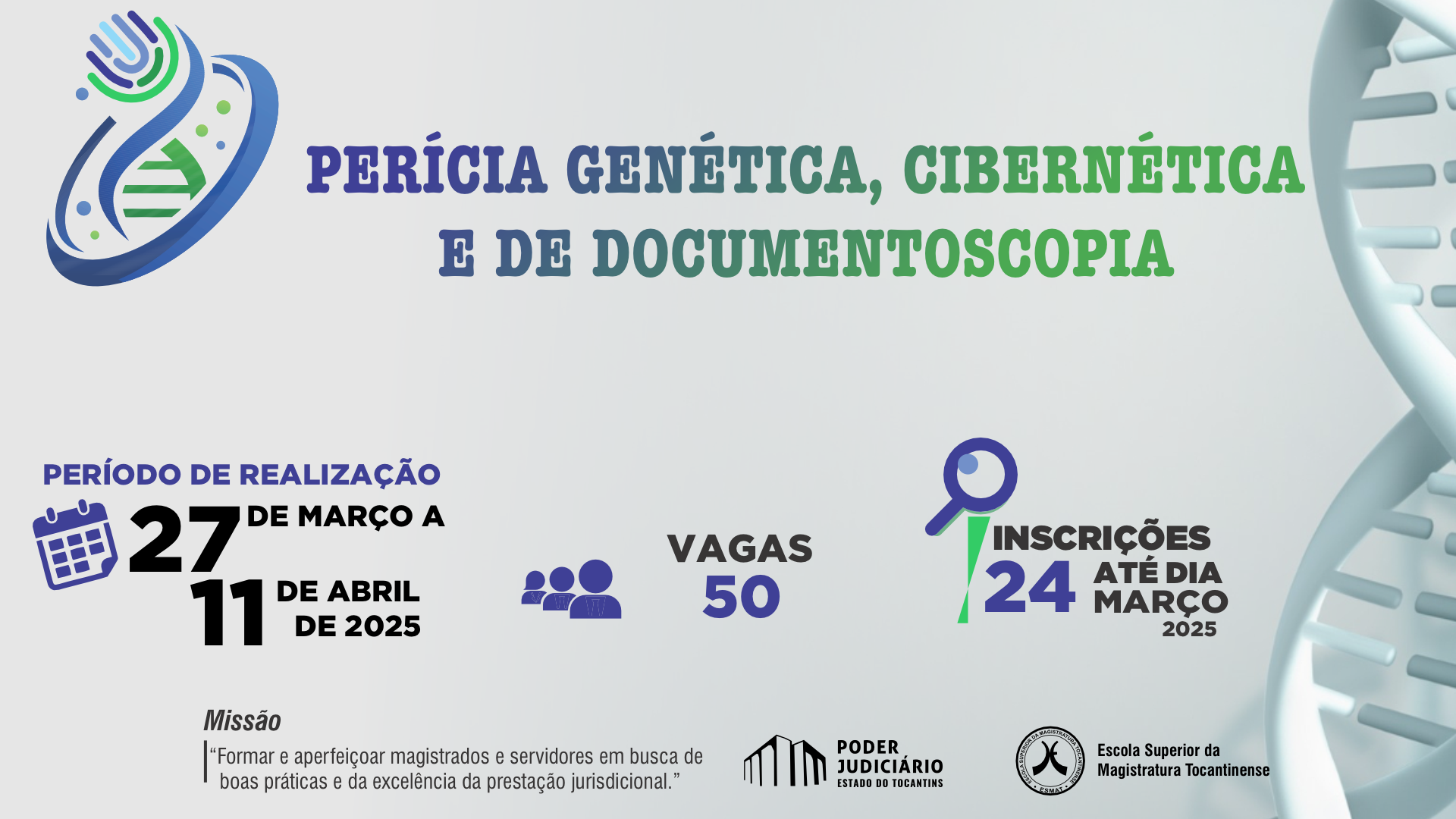 A Escola Superior da Magistratura Tocantinense (Esmat) abre as inscrições para o curso “Perícia Genética, Cibernética e de Documentoscopia”, que será desenvolvido no período de 27 de março a 11 de abril. Estão sendo ofertadas cinquenta vagas, sendo vinte para magistrados(as); vinte e cinco para servidores(as) do Poder Judiciário Tocantinense que atuam preferencialmente nas Varas e nas Câmaras Criminais; e cinco para o público externo (advogados(as) e/ou parceiros(as) do Sistema de Justiça).