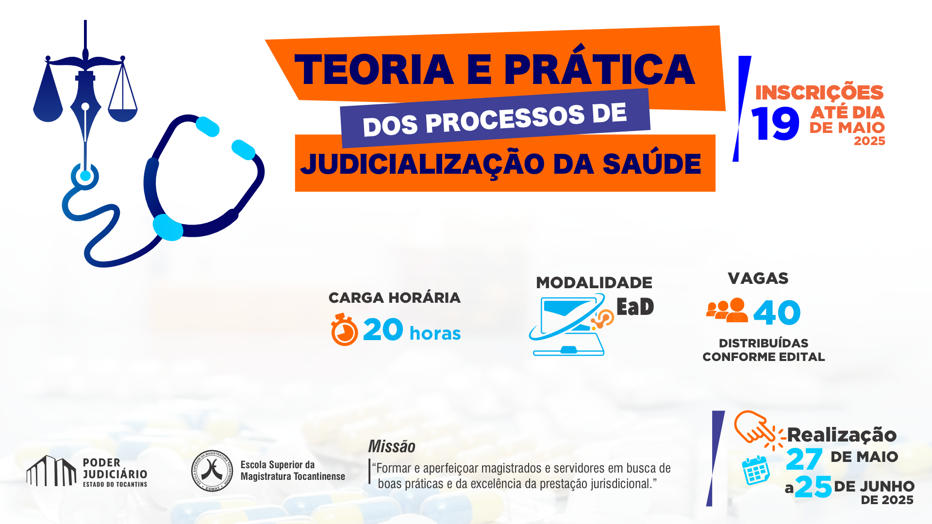 A Escola Superior da Magistratura Tocantinense (Esmat) promove o curso Teoria e Prática dos Processos de Judicialização da Saúde, que será realizado no período de 27 de maio a 25 de junho, por meio do Ambiente Virtual de Aprendizagem da Esmat (AVA) e pela plataforma Google Meet.