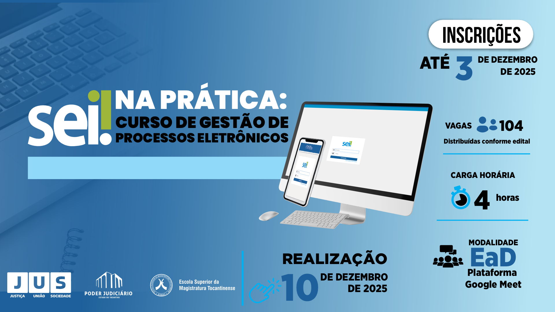 A Escola Superior da Magistratura Tocantinense (Esmat) realiza, no dia 10 de dezembro, das 14h às 18h, o curso “SEI na Prática: Curso de Gestão de Processos Eletrônicos”. A atividade ocorre na modalidade EaD, por meio da plataforma Google Meet.