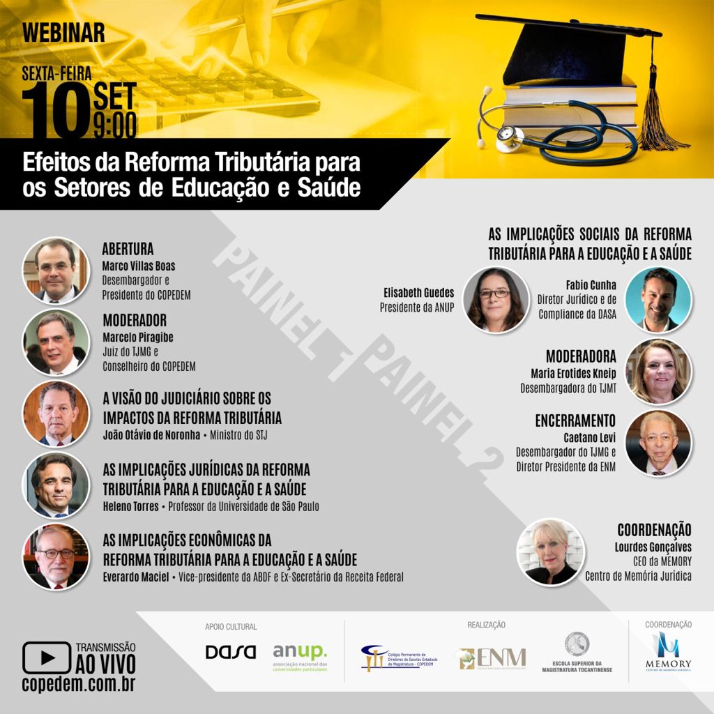 Com a proposta de discutir as mudanças e as consequências da Reforma Tributária as quais tramitam em discussão na Câmara dos Deputados, tendo em vista os impactos econômicos e sociais nas áreas da Saúde e da Educação, o Colégio Permanente dos Diretores das Escolas da Magistratura (COPEDEM), em parceria com a Escola Nacional da Magistratura (ENM) e a Escola Superior da Magistratura Tocantinense (ESMAT) promovem no próximo dia 10 de setembro, a partir das 9 horas, o webinar “Efeitos da Reforma Tributária para os Setores de Educação e de Saúde”. O Evento será transmitido pela página do Copedem na plataforma YouTube.