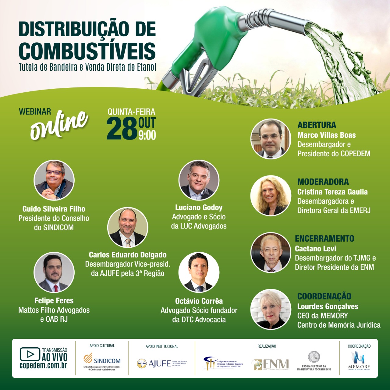 Em seguimento às programações de debates virtuais acerca de temas relevantes da atualidade, o Colégio Permanente de Diretores de Escolas Estaduais da Magistratura (COPEDEM) em parceria com a Escola Nacional da Magistratura (ENM) e com a Escola Superior da Magistratura Tocantinense (ESMAT), sob a Coordenação da Memory – Memória Jurídica –, realizam, no dia 28 de outubro de 2021, o Webinar Distribuição de Combustíveis: Tutela de Bandeira e Venda Direta de Etanol.