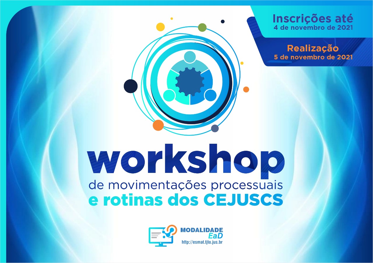 Estão abertas, e vão até o dia 4 de novembro de 2021, as inscrições para o Workshop de Movimentações Processuais e Rotinas dos Cejuscs, a ser realizado pela Escola Superior da Magistratura Tocantinense com carga horária total de 2 horas-aula, na modalidade de Ensino à Distância (EaD).