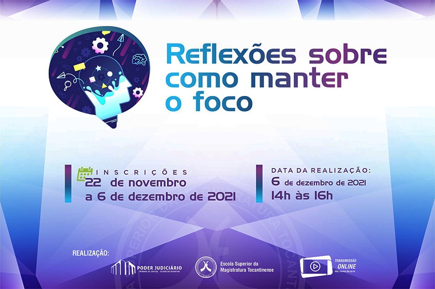 Estão abertas as inscrições para a Palestra Reflexões sobre como manter o foco. Organizado pela Escola Superior da Magistratura Tocantinense, o Evento será realizado na modalidade ensino à distância, via Plataforma de transmissão da Esmat, e ocorre no dia 6 de dezembro de 2021.