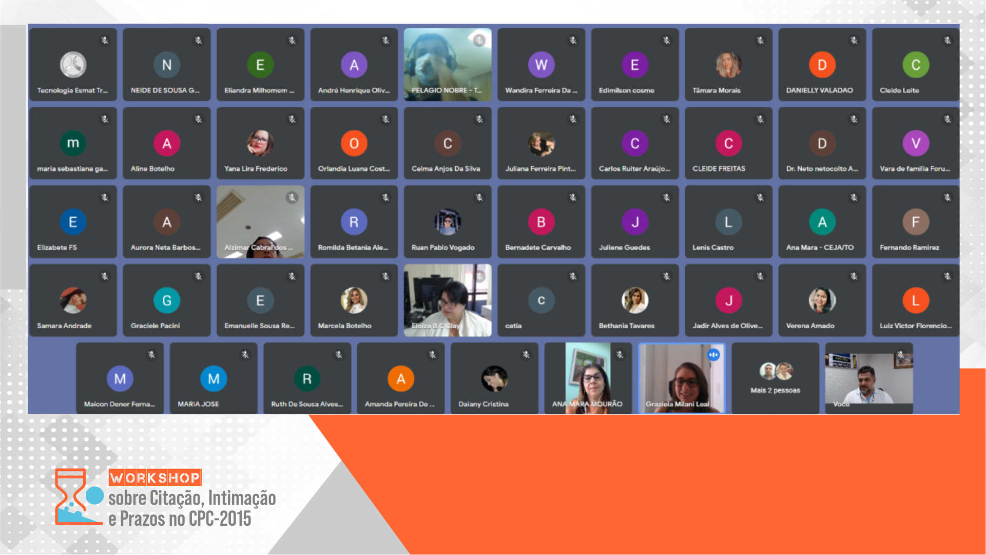 Magistrados(as) e servidores(as) do Poder Judiciário Tocantinense participaram, nessa terça-feira (13), do Workshop sobre Citação, Intimação e Prazos no CPC-2015. Promovido pela Escola Superior da Magistratura Tocantinense (ESMAT), a capacitação ocorreu de forma virtual, pela Plataforma Google Meet.