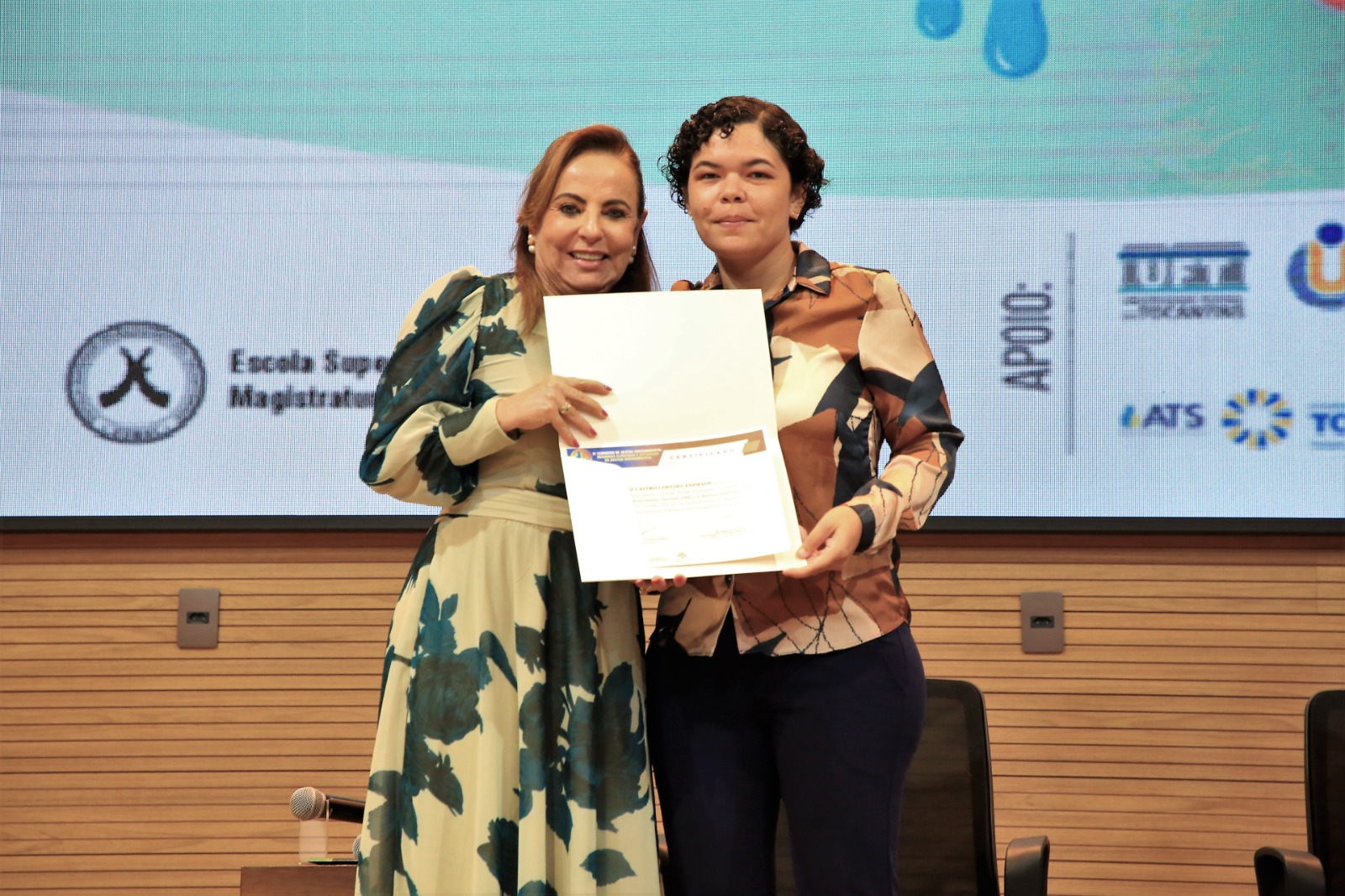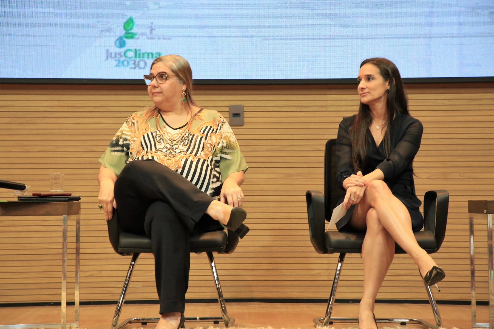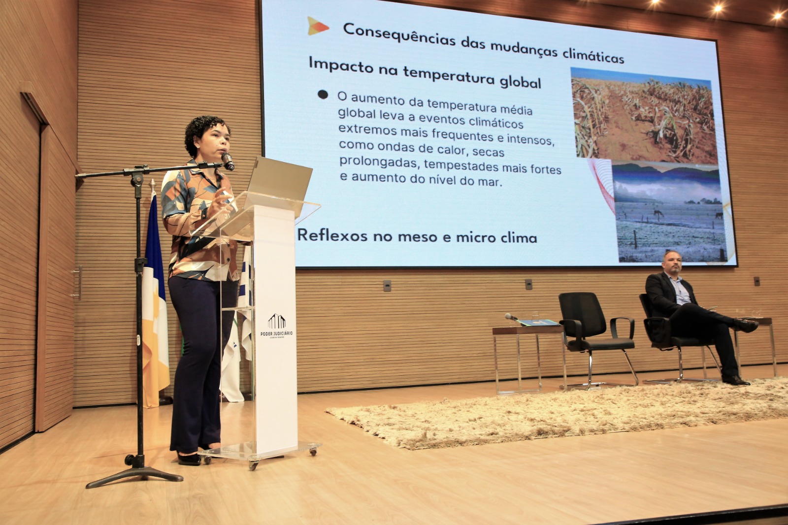 Na primeira palestra do dia, a juíza federal Rafaela Santos Martins da Rosa, coordenadora do Jusclima 2030 e atuante na Justiça Federal do Rio Grande do Sul, abordou o tema "O papel do Poder Judiciário no enfrentamento da emergência climática". A juíza ressaltou a importância de todos os órgãos e poderes atuarem diante da iminente emergência climática e lembrou que estamos próximos de atingir um aumento de um grau e meio se não cumprirmos as metas estabelecidas no acordo de Paris. Ela destacou que o Judiciário desempenha um papel fundamental na gestão interna, implementando planos de compensação e mitigação, além de atuar na atividade jurisdicional, especialmente no campo da litigância climática.