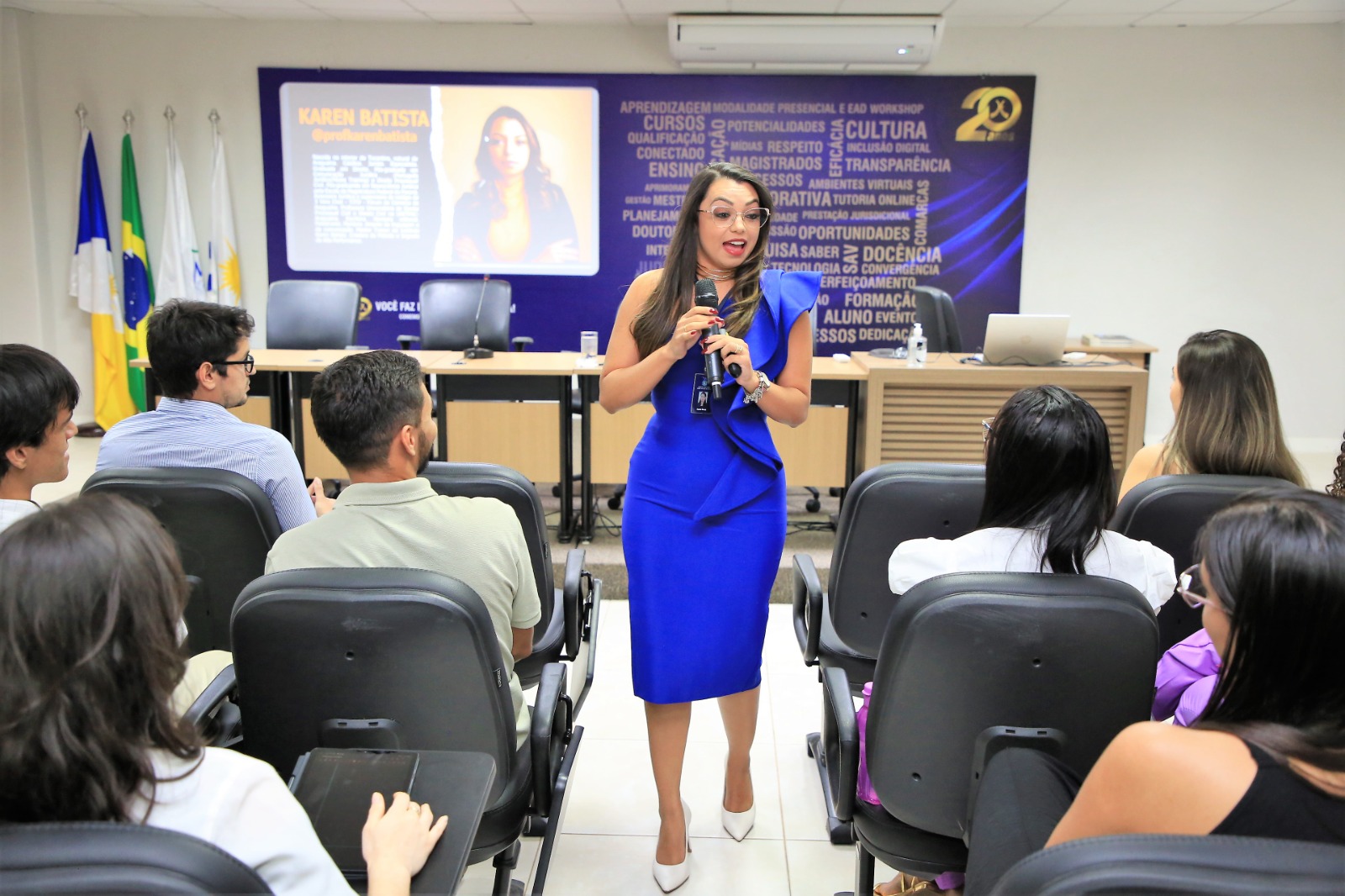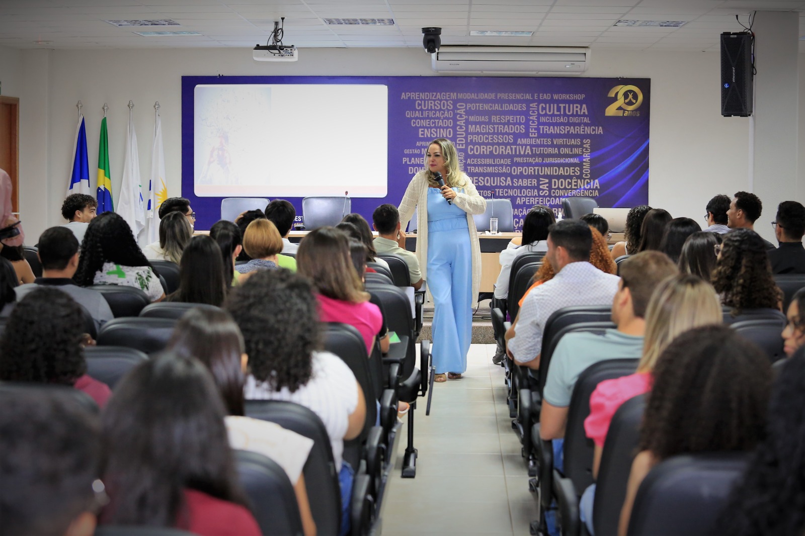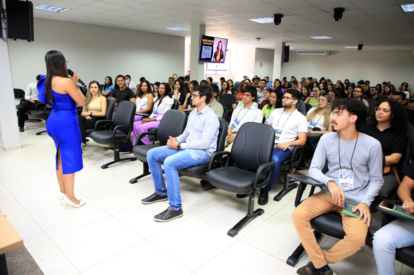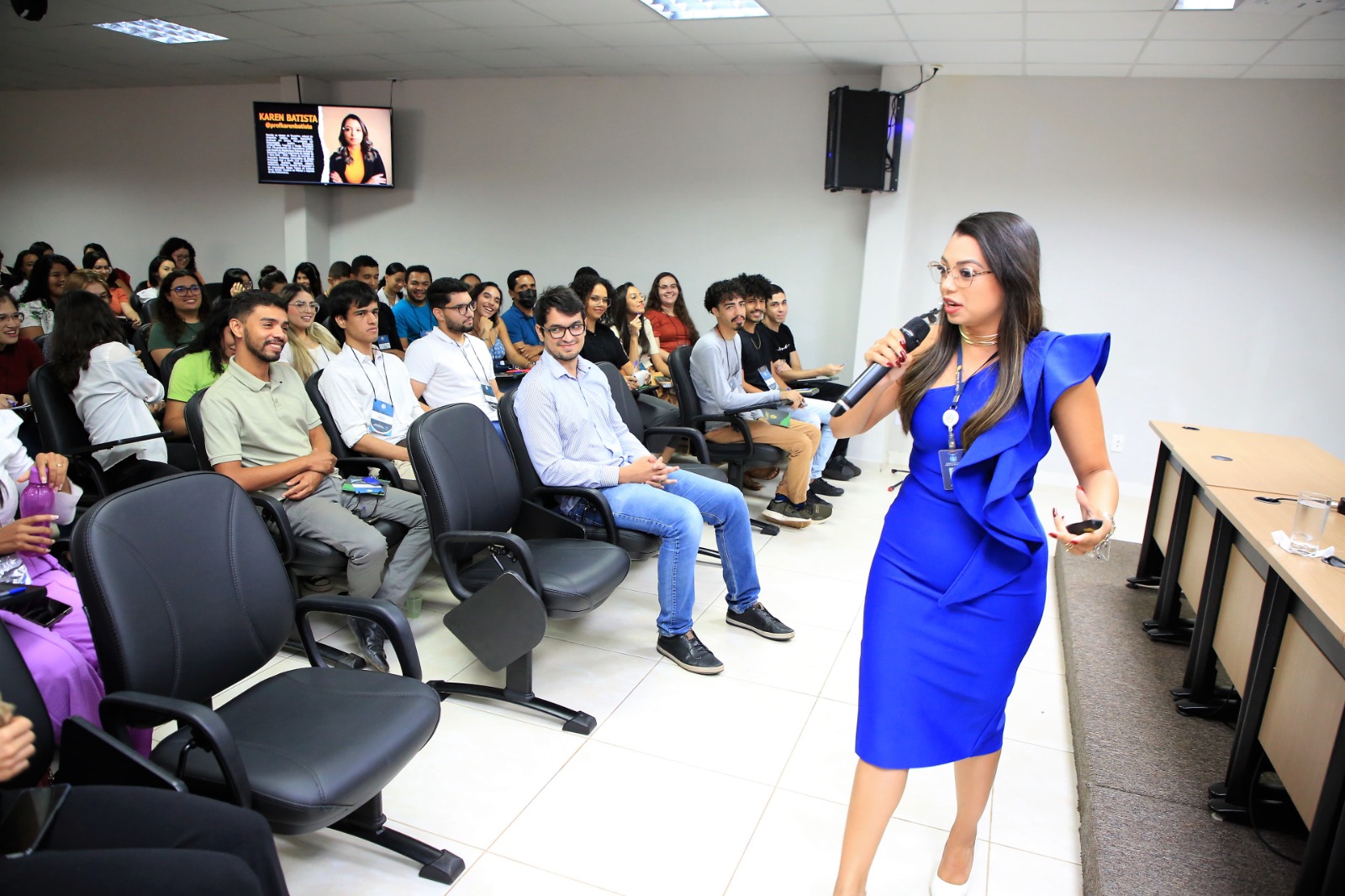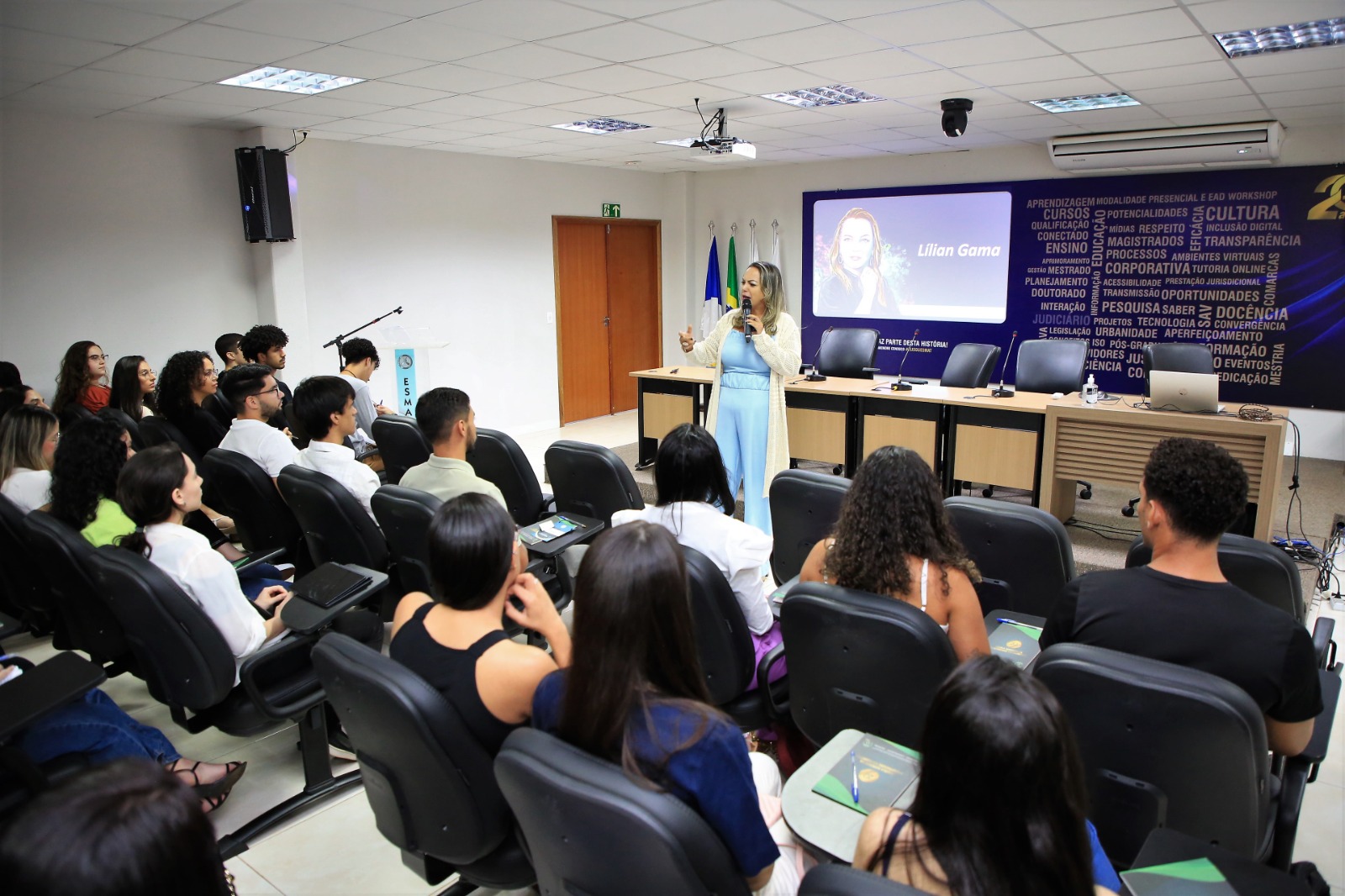 Para Karen Batista, foi uma grande emoção estar no auditório da Esmat. Ela foi estagiária do Tribunal de Justiça e acabou por se ver em cada um dos(as) que estavam presentes para a comemoração. Ela atualmente é professora de Direito Processual Civil, escritora e assessora do Tribunal de Justiça da 3° Vara Cível de Araguaína deu uma aula de automotivação e de escalada para o sucesso a partir da oportunidade do estágio.