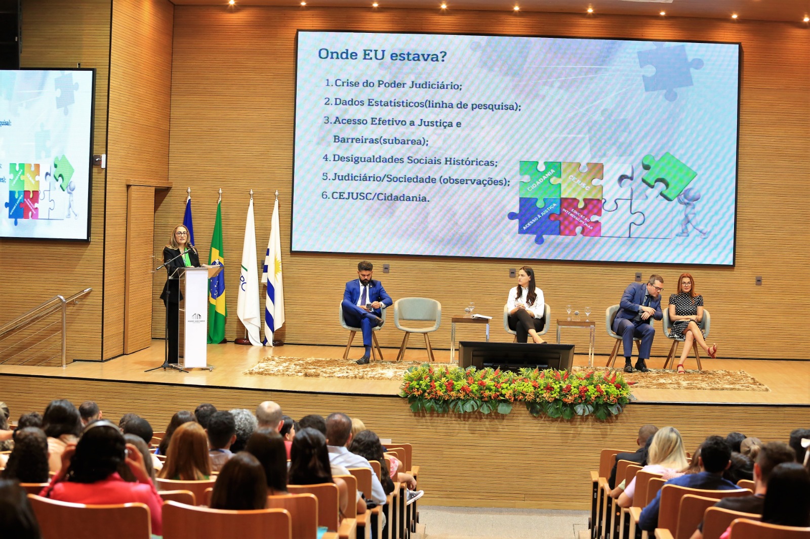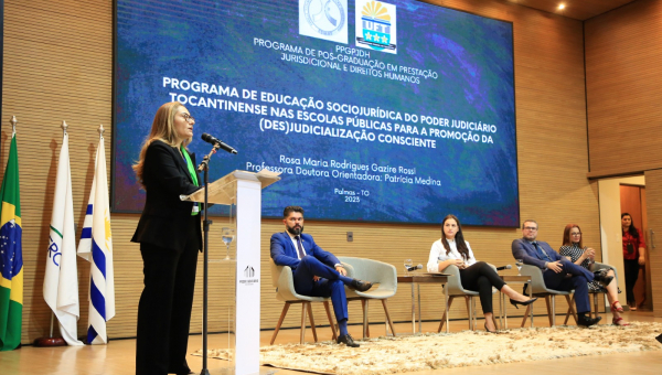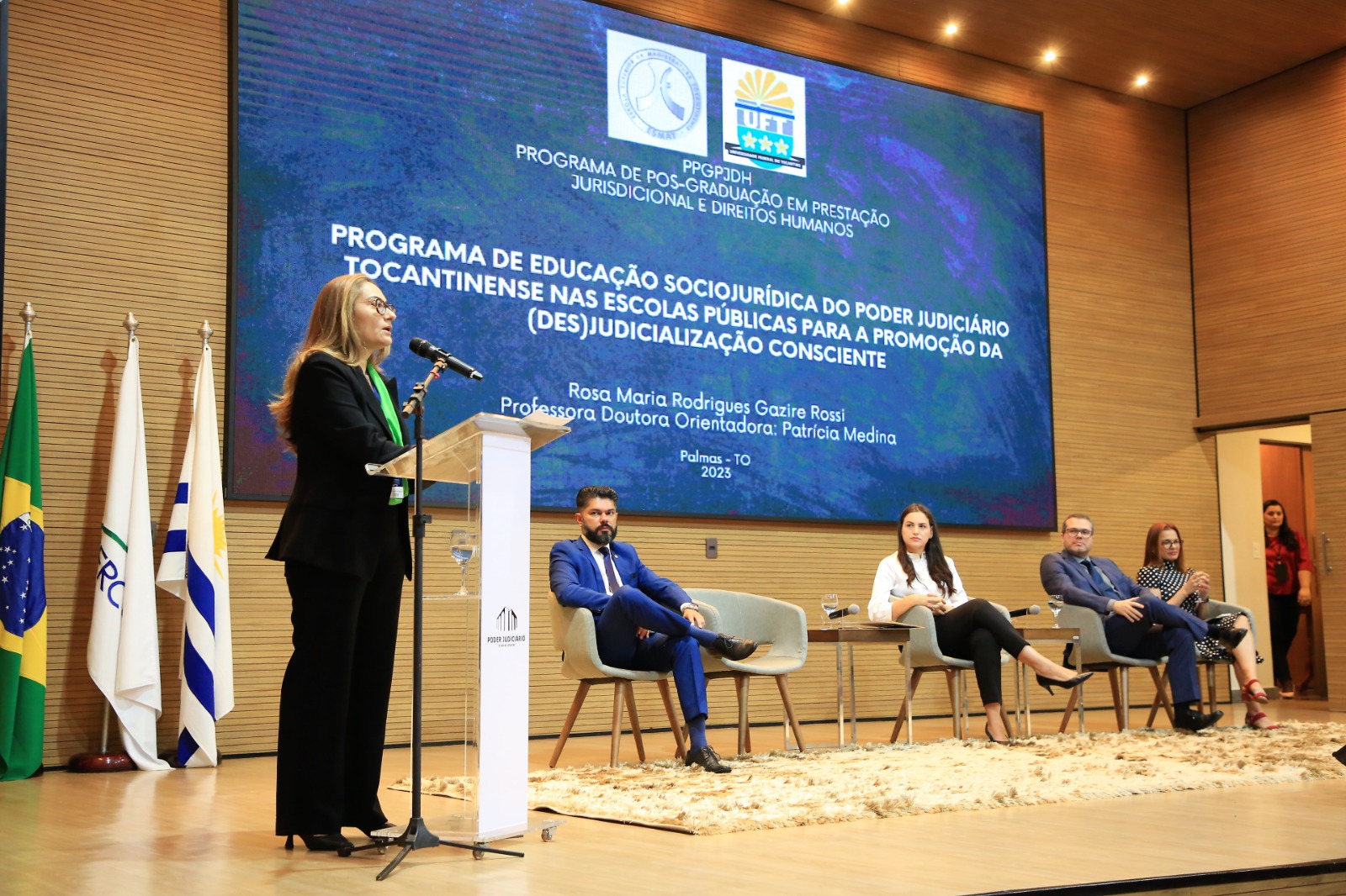 A juíza de direito e mestranda do Programa de Pós-Graduação Profissional e Interdisciplinar em Prestação Jurisdicional e Direitos Humanos, Rosa Maria Rodrigues Gazire Rossi, deu início às sessões com seu projeto sobre o "Programa de Educação Sociojurídica Interdisciplinar e Itinerante do Poder Judiciário nas Escolas Públicas do Tocantins para Promoção da (Des) Judicialização Consciente".