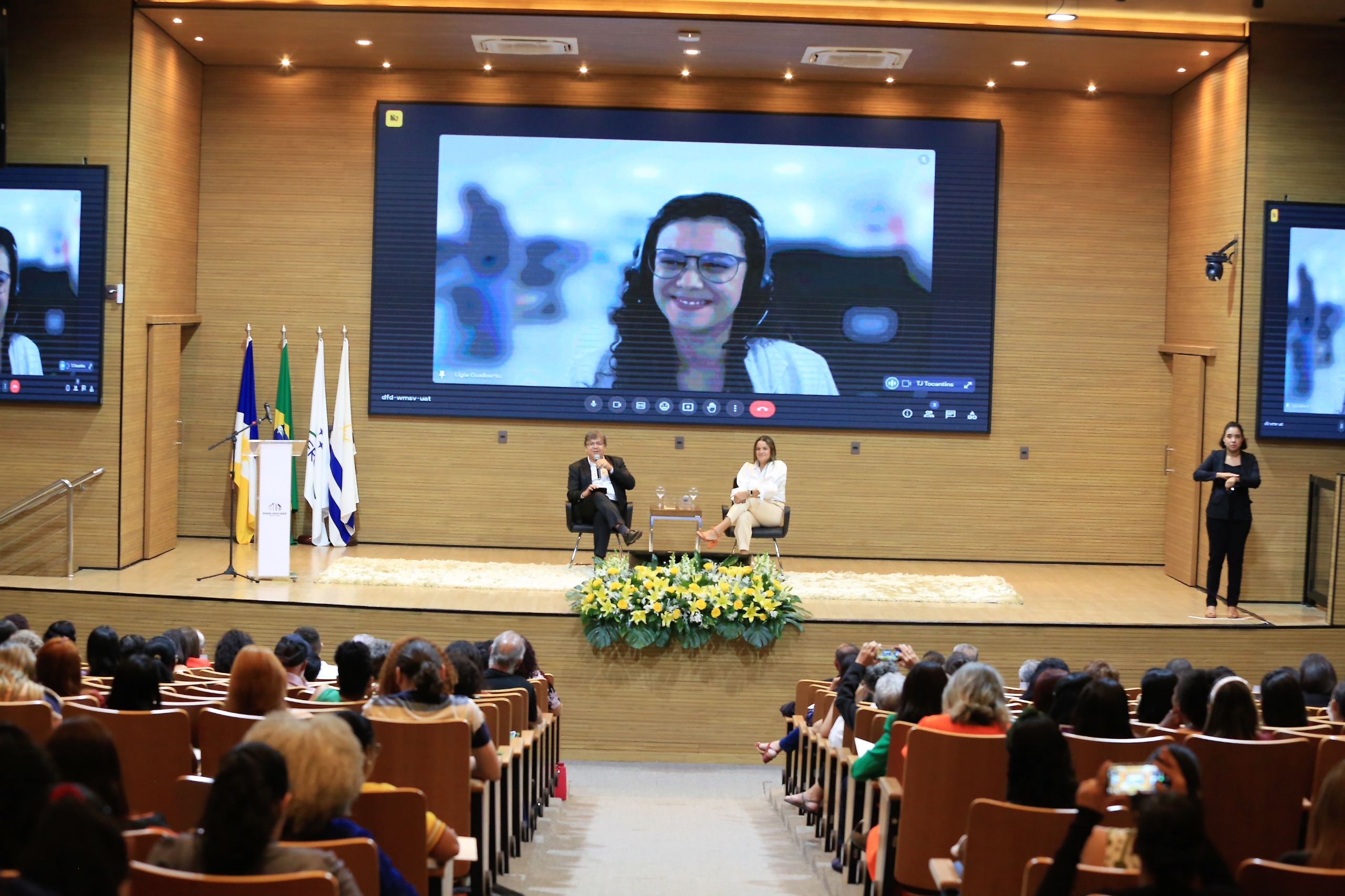 A painelista e pesquisadora Érica Pollyana Oliveira Nunes, profissional credenciada do GGEM/TJTO, dividiu o palco do auditório do Tribunal de Justiça do Estado do Tocantins (TJTO) com o mediador Juiz Ariosténis Guimarães Vieira, coordenador da Coordenadoria da Cidadania do TJTO.