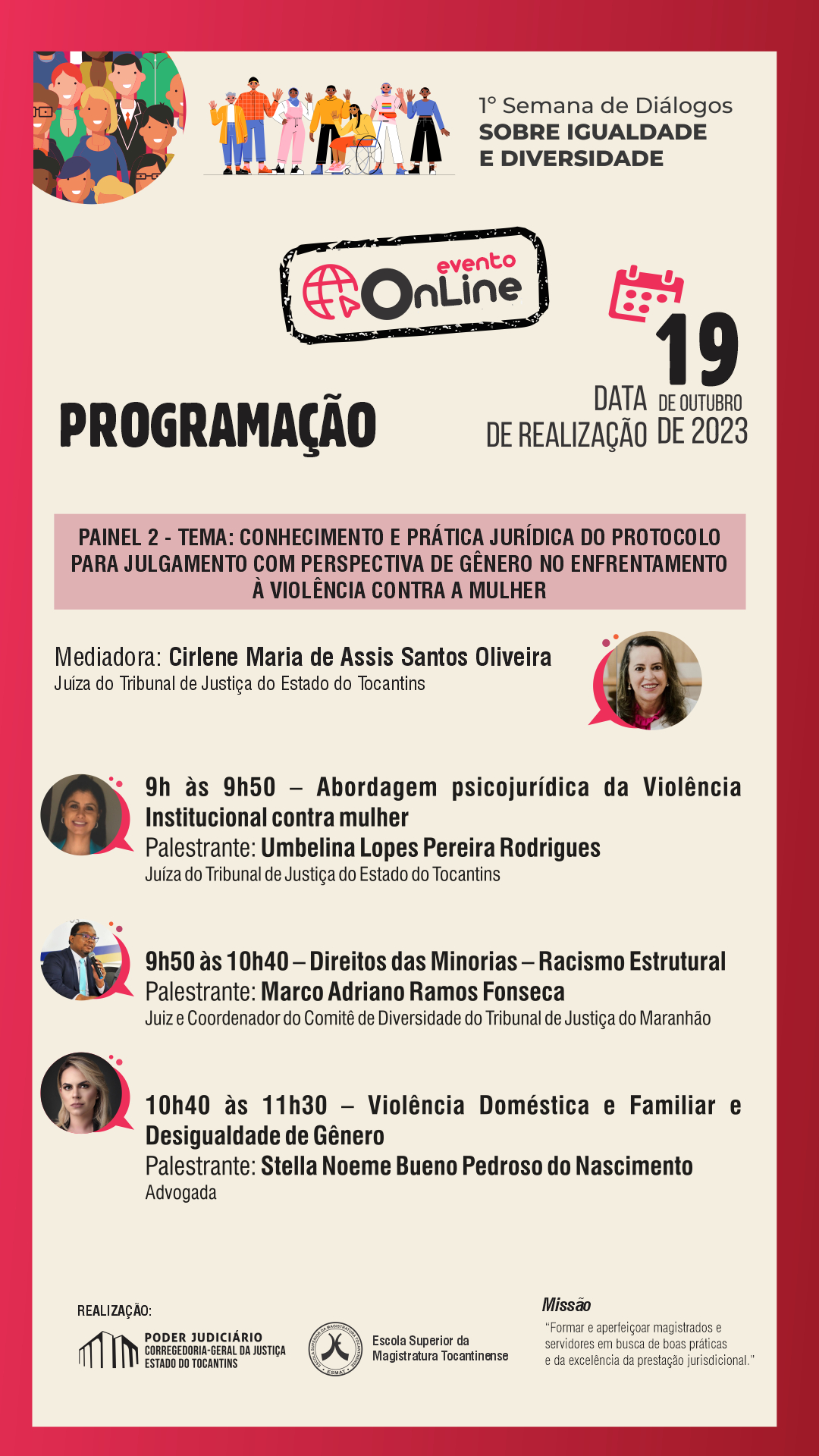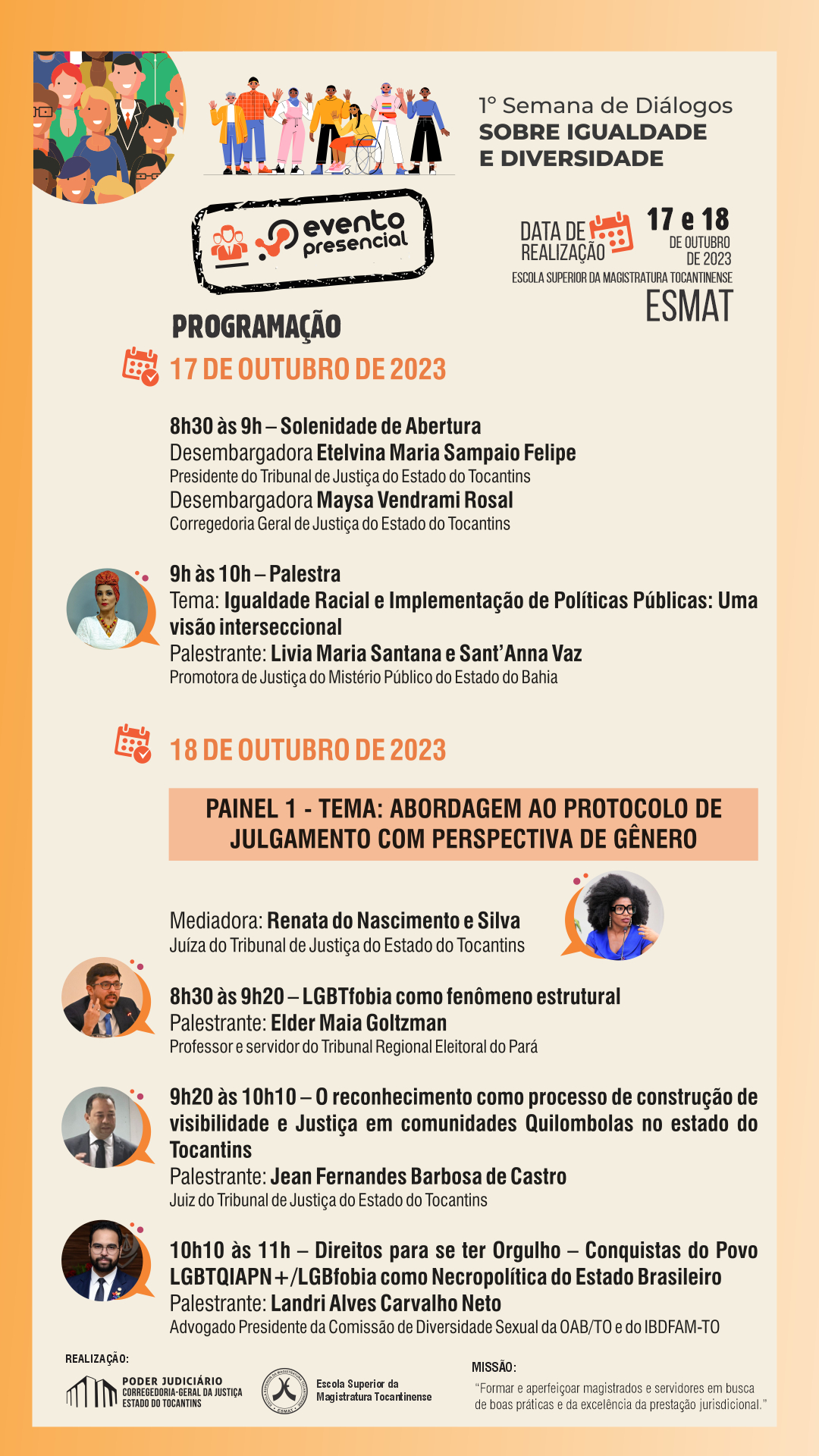 Estão abertas as inscrições para as atividades da I Semana de Diálogos sobre Igualdade e Diversidade. A ação, promovida pela Escola Superior da Magistratura Tocantinense (ESMAT), visa promover o entendimento, sensibilização e engajamento sobre questões relacionadas à igualdade e à diversidade. Por meio de discussões, o Evento busca fortalecer a consciência sobre a importância da igualdade de direitos e o valor da diversidade em ambientes sociais e profissionais, visando criar um ambiente mais inclusivo e equitativo.