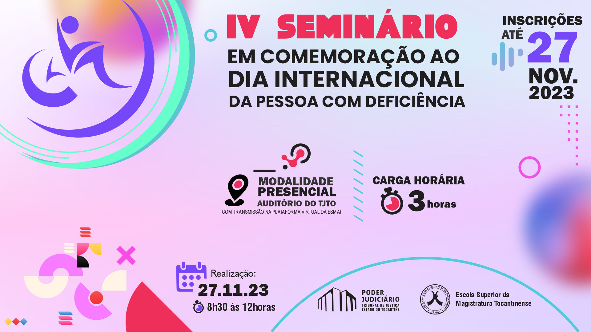 O Seminário também será transmitido pela Plataforma Virtual da Escola Superior da Magistratura Tocantinense (ESMAT), porém apenas para os(as) participantes matriculados(as) nas cidades do interior do Tocantins e demais regiões. A atividade visa promover a reflexão, a sensibilização e o debate acerca das questões relacionadas à inclusão e empoderamento das pessoas com deficiência, buscando fortalecer a conscientização da sociedade e fomentar a adoção de práticas inclusivas, tecnológicas e arquitetônicas em diversos âmbitos da vida social, educacional e profissional.