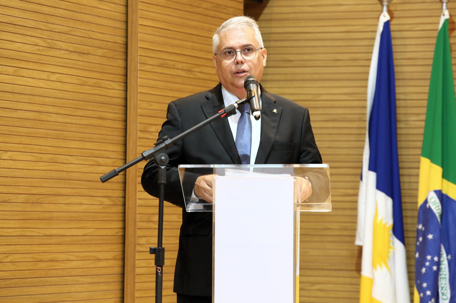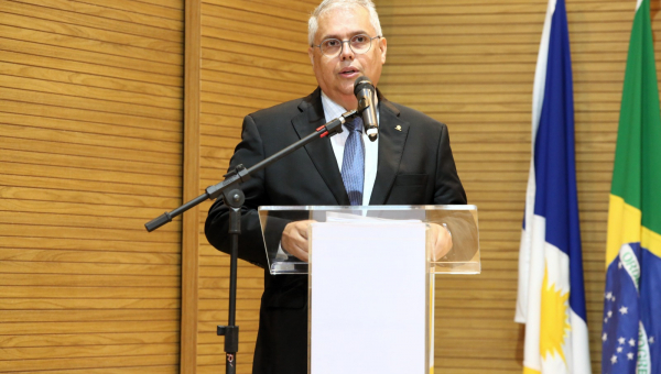 Conselheiro Severiano falando ao microfone; ele é um home de cabelos brancos, usa óculos, terno escuro, gravata azul e camisa branca