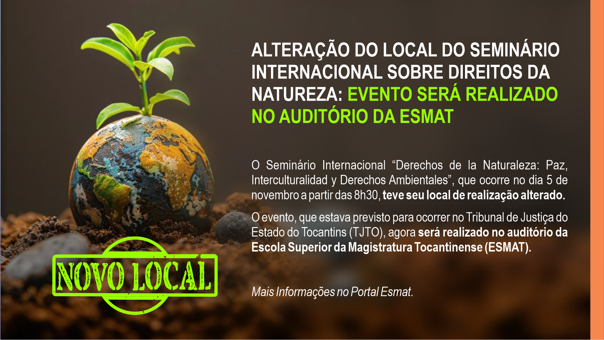 O evento, que estava previsto para ocorrer no Tribunal de Justiça do Estado do Tocantins (TJTO), agora será realizado no auditório da Escola Superior da Magistratura Tocantinense (Esmat). A mudança foi realizada para acomodar melhor o público e garantir a segurança de todos(as) os(as) participantes, considerando o número de inscritos(as).