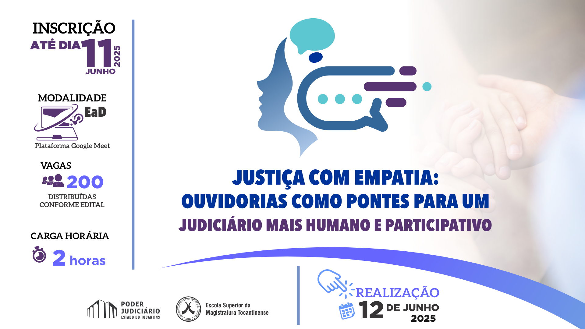 Magistrados(as), servidores(as) e estagiários(as) do Poder Judiciário Tocantinense ainda podem se inscrever para a palestra “Justiça com Empatia: Ouvidorias como pontes para um Judiciário mais humano e participativo”, que será realizada nessa quinta-feira, 12 de junho, das 14h às 16h, por meio da plataforma Google Meet.