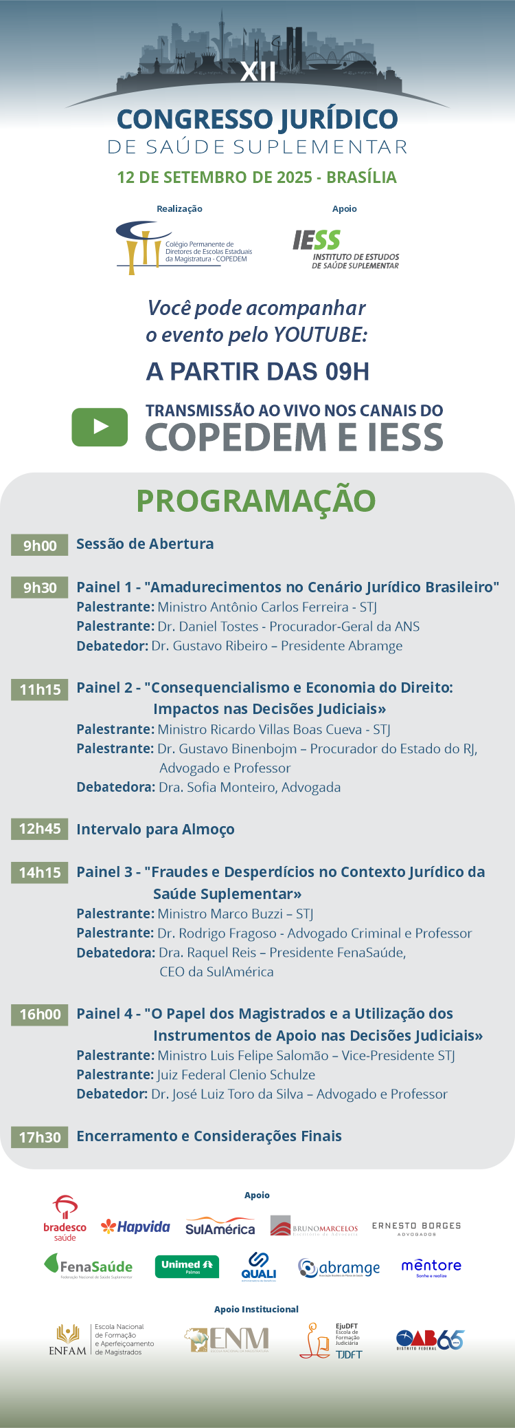 Com transmissão ao vivo pelos canais do Copedem e do IESS no YouTube, a programação do Congresso inclui quatro painéis temáticos que abordarão os seguintes assuntos: amadurecimentos no cenário jurídico nacional; consequencialismo e economia do direito; fraudes e desperdícios na saúde suplementar; e o papel dos(as) magistrados(as) na utilização de instrumentos de apoio às decisões judiciais.