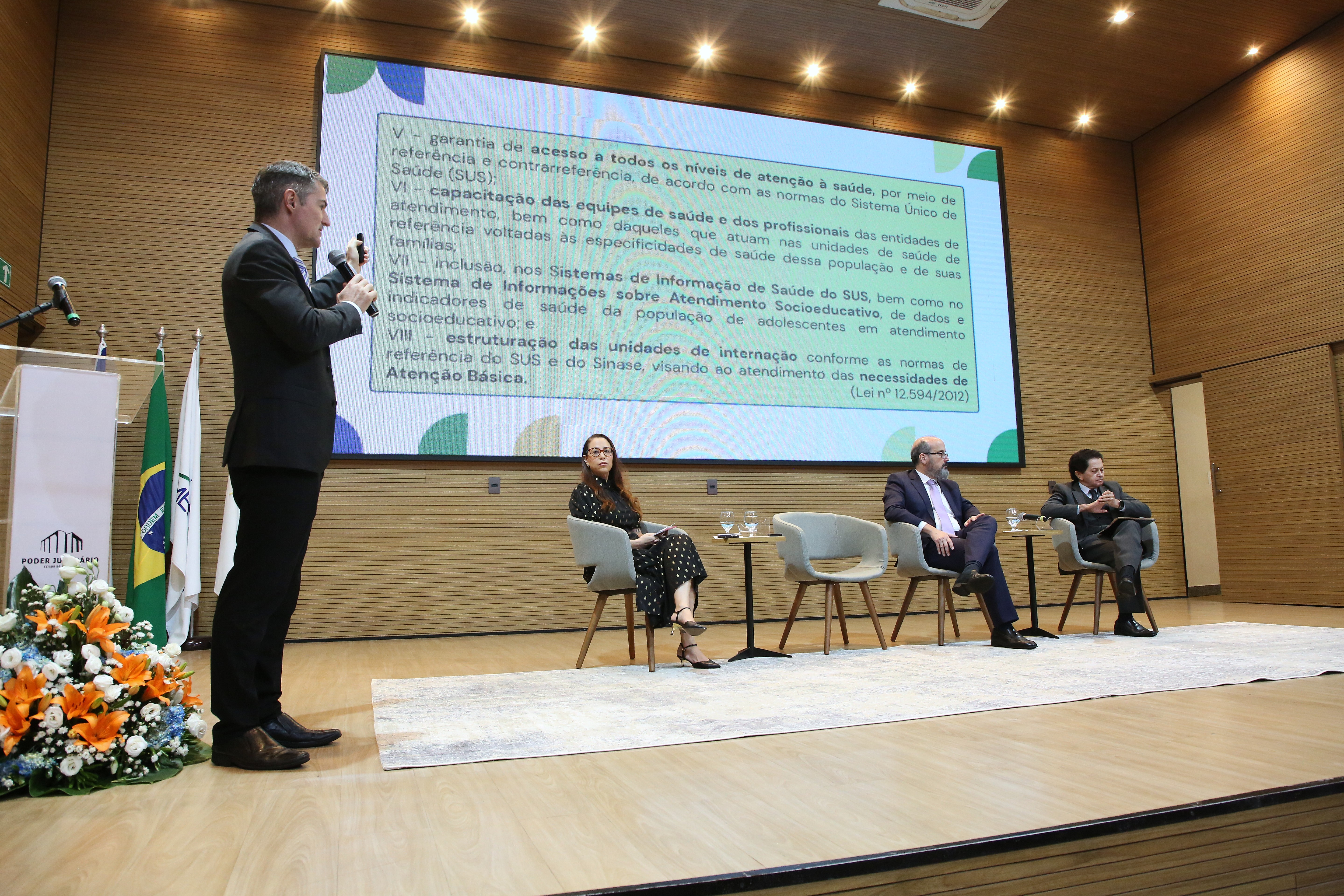O promotor de Justiça Sidney Fiore Júnior, do Centro de Apoio Operacional da Infância, Juventude e Educação (CAOPIJE/MPTO), apresentou a legislação que ampara o direito à saúde mental de adolescentes em cumprimento de medidas socioeducativas. Destacou a Política Nacional de Atenção Integral à Saúde de Adolescentes em Conflito com a Lei (PNAISARI), instituída pela Portaria nº 1.932, de 2014, e defendeu a atuação articulada entre as redes de saúde, educação e assistência social. “A privação de liberdade não pode significar a privação de saúde”, enfatizou.