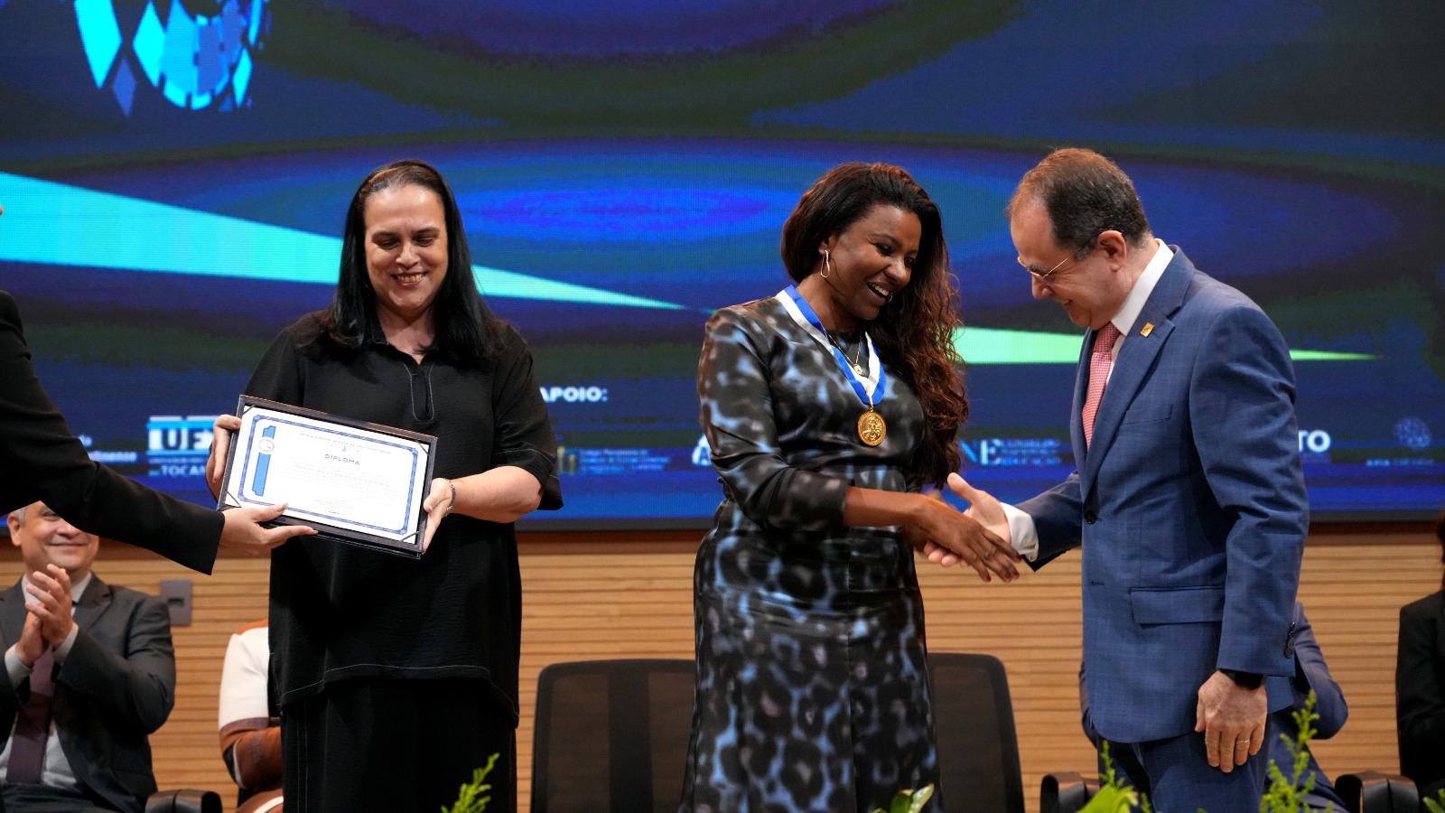 A reitora ressaltou a importância da parceria com a Esmat nos Programas de Mestrado. “Este congresso é um momento de muita alegria. Já participei de outros e é sempre muito bom. Temos hoje mestrado e doutorado profissional, com juízes(as), desembargadores(as), promotores(as), advogados(as), pedagogos(as), historiadores(as), todos juntos nesse mesmo espaço. É uma parceria profícua. Essa medalha será guardada com muito carinho, e mostrada à minha filha. Quero dizer a ela: ‘Filha, você pode chegar lá’. Espero não ser a última mulher preta a ser reitora da UFT. Quero ser a primeira e que muitas outras venham depois, porque o Tocantins tem 74% da população negra, e a maioria está na universidade. Então, elas podem chegar aqui”, pontuou.