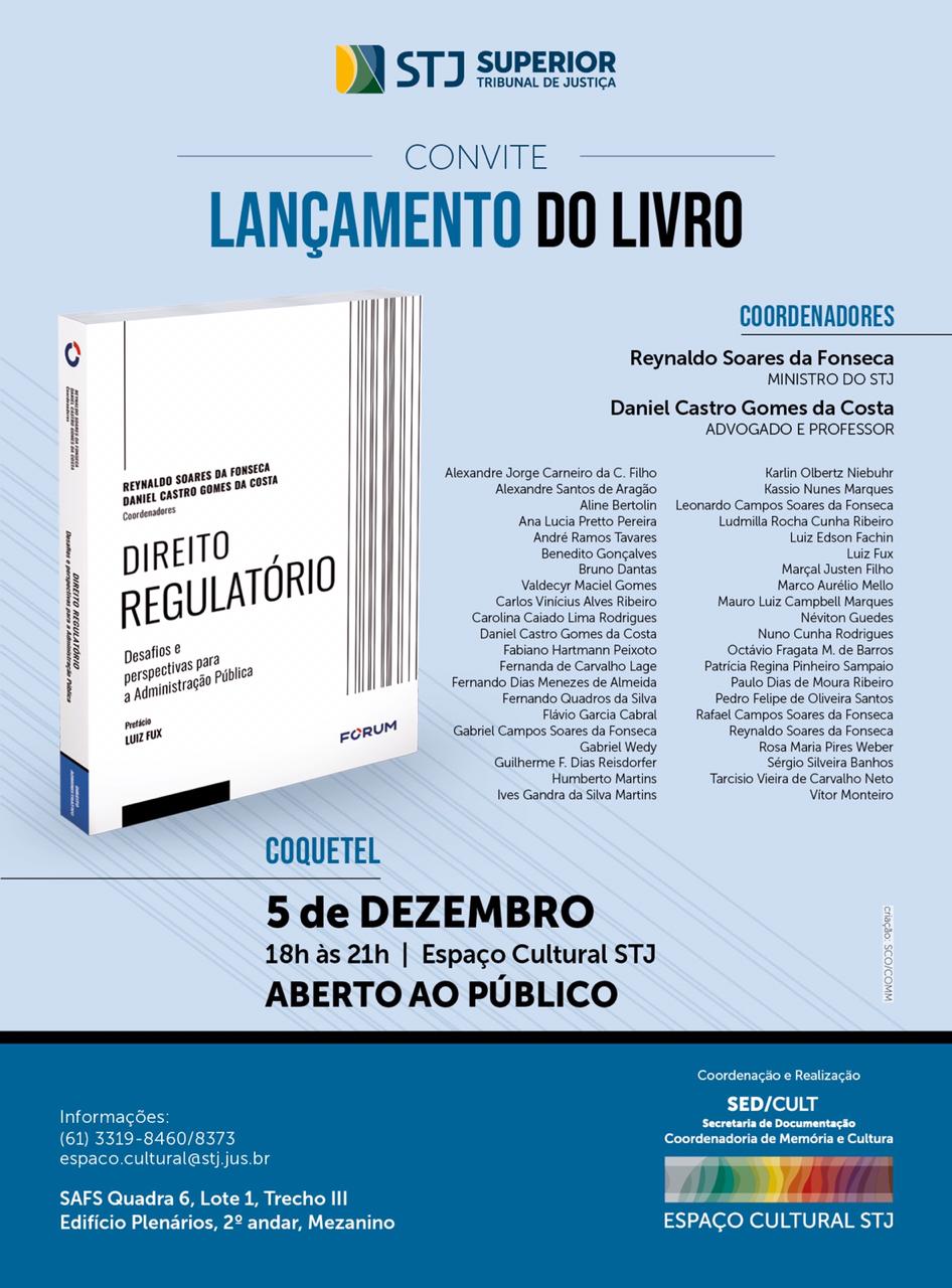 O lançamento do Livro Direito Regulatório: Desafios e Perspectivas para a Administração Pública será realizado no dia 5 de dezembro de 2019, das 18h às 21h, no Espaço Cultural do Superior Tribunal de Justiça. A obra é coordenada por Reynaldo Soares da Fonseca, ministro do Superior Tribunal de Justiça (STJ) e por Daniel Castro Gomes da Costa, advogado e professor.