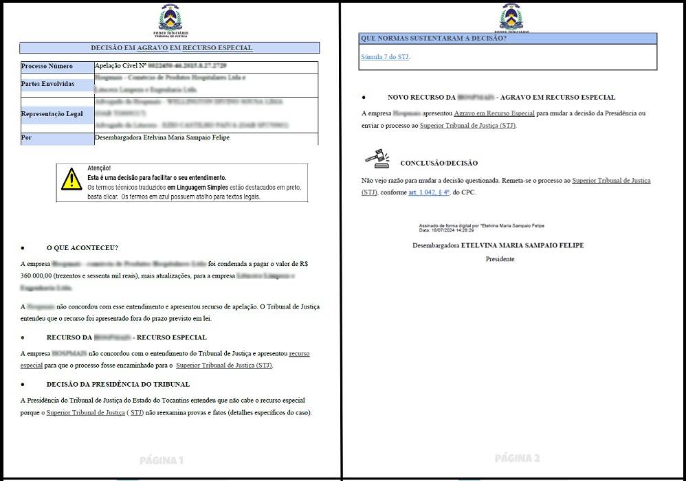 Ten decisions are published in simple language and with a layout using visual resources to make them easier to understand. According to the project, in this pilot, the simple language is being implemented in "Interlocutory Appeal" cases. The documents already published deal with cases involving the validation of a degree obtained abroad by a university in the State of Tocantins and a collection action among companies.