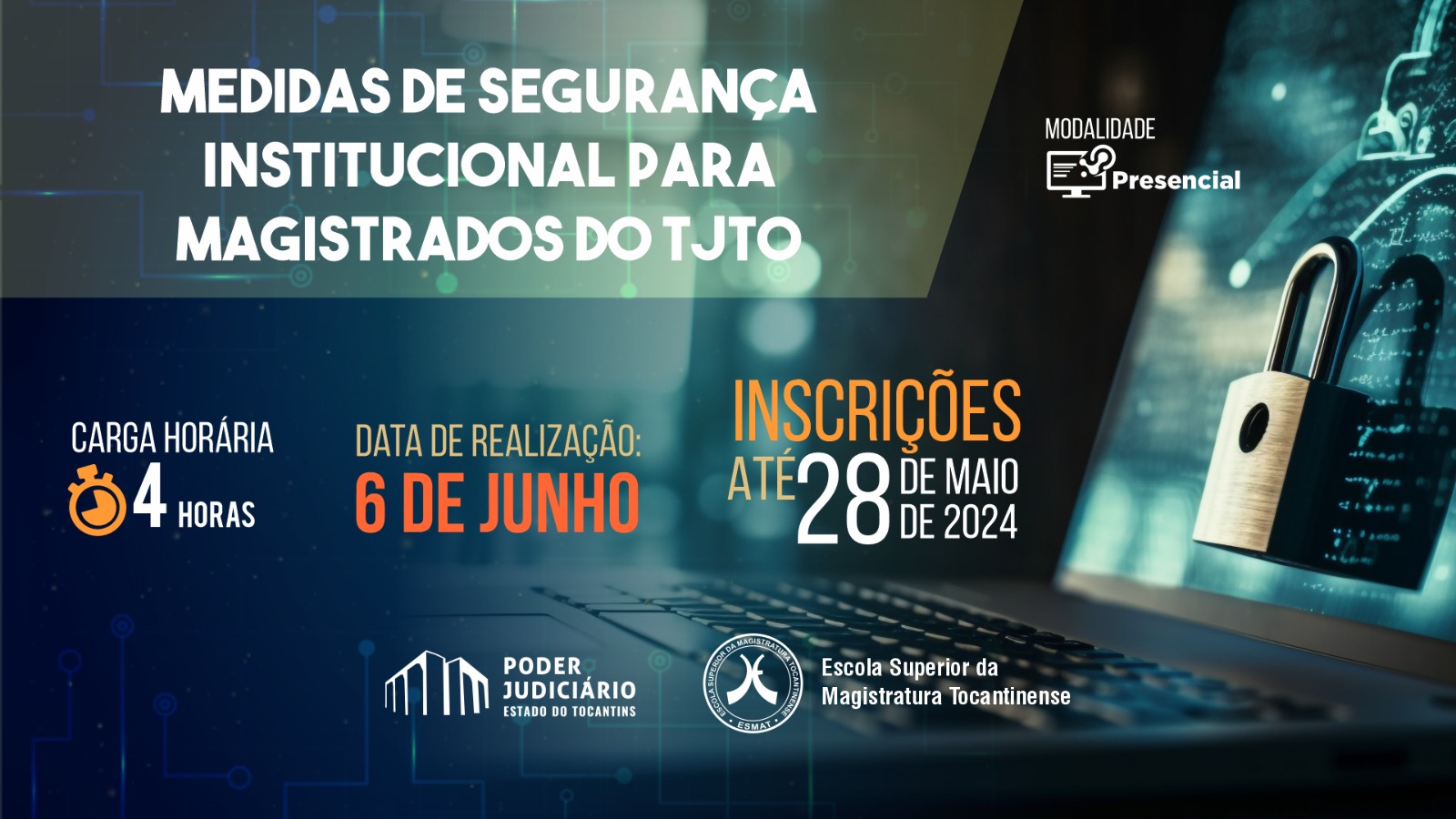 The Superior School of the Judges of the State of Tocantins (Esmat) is now open for registration for a course on Institutional Security Measures for magistrates of the Court of Justice of the State of Tocantins (TJTO). The activities will be taught by Professors Claudemir Pantaleão Câmara and Marco Antonio Martins Santos, and they will take place on June 6th, from 2pm to 6pm, in person, in the auditorium of the TJTO.