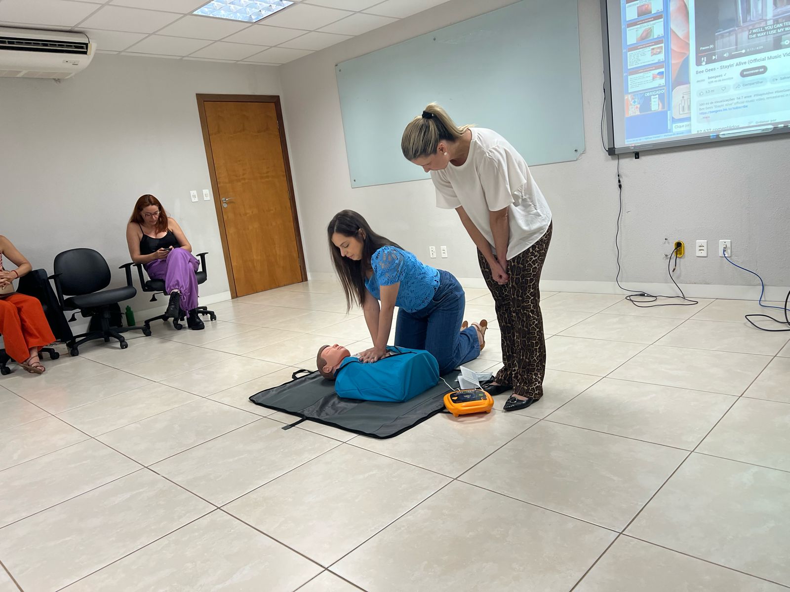 The Basic Life Support course, now in its second year, lasted 4 hours and was taught by facilitators Elaine Cristina Ferreira and Bruno Ribeiro Rocha.