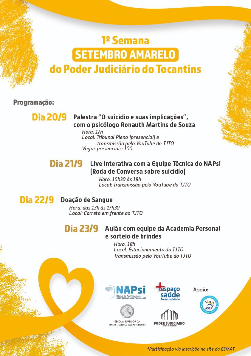The Judiciary of the State of Tocantins in partnership with the Superior School of the Judges of the State of Tocantins and the Center for Reception and Psychosocial Follow-up (NAPsi) promote, on September 21st, 2021, starting at 4:20 pm, the Conversation Circle: Yellow September - Talking, acting, and saving lives.