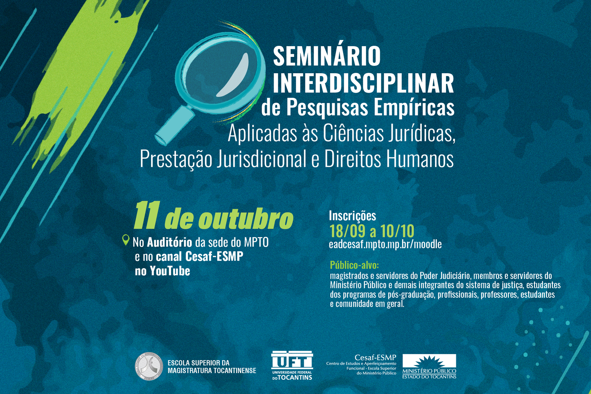 Registrations are now open for the Interdisciplinary Seminar on Empirical Research Applied to Legal Sciences, Judicial Provision and Human Rights, promoted by the Center for Studies and Functional Improvement - School of the State Prosecution Office (Cesaf/ESMP), the Superior School of the Judges of the State of Tocantins (Esmat) - through the Professional and Interdisciplinary Master's Degree in Judicial Provision and Human Rights (PPGPJDH) - and the Federal University of the State of Tocantins (UFT).