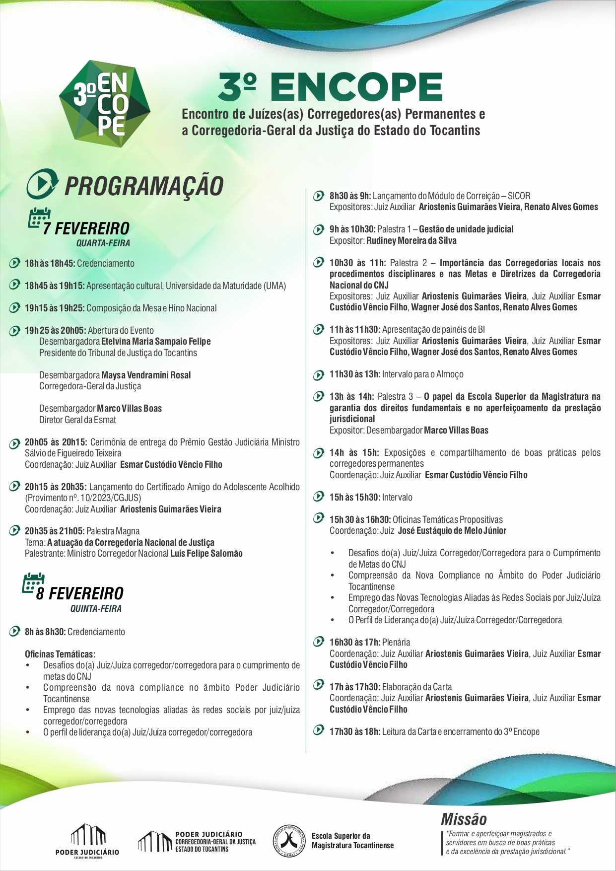 O Poder Judiciário realiza, dias 7 e 8 de fevereiro, o 3º Encontro de Juízes(as) Corregedores(as) Permanentes e Corregedoria Geral da Justiça do Estado do Tocantins (Encope), que terá como tema "Corregedorias Locais: Aperfeiçoando os Serviços da Justiça Estadual". O primeiro dia de programação (07/02) será realizado no auditório do Tribunal de Justiça do Estado do Tocantins (TJTO) e contará com palestra magna do corregedor nacional de Justiça, ministro Luís Felipe Salomão, sobre o papel das corregedorias na celeridade processual e redução de litígios. Evento é aberto à sociedade e terá certificação aos estudantes universitários. As inscrições devem ser feitas até o dia 05 de fevereiro.