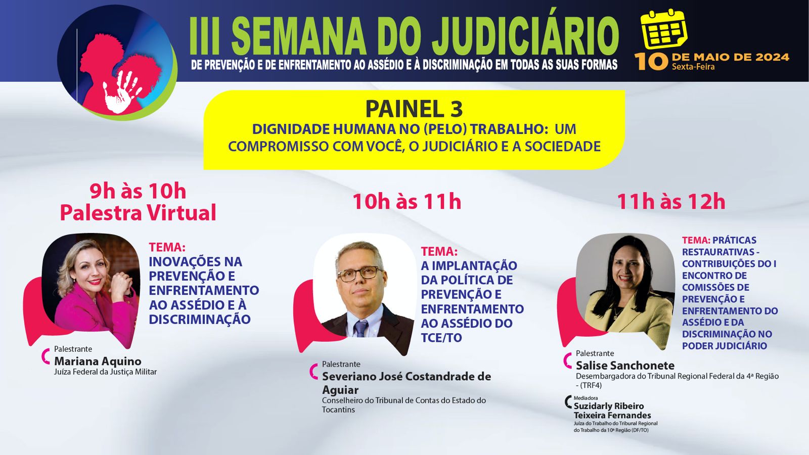 The programming for the last panel includes relevant topics, such as the lecture on "Innovations in preventing and combating harassment and discrimination", given by the Federal Judge of Military Justice, Mariana Aquino.
