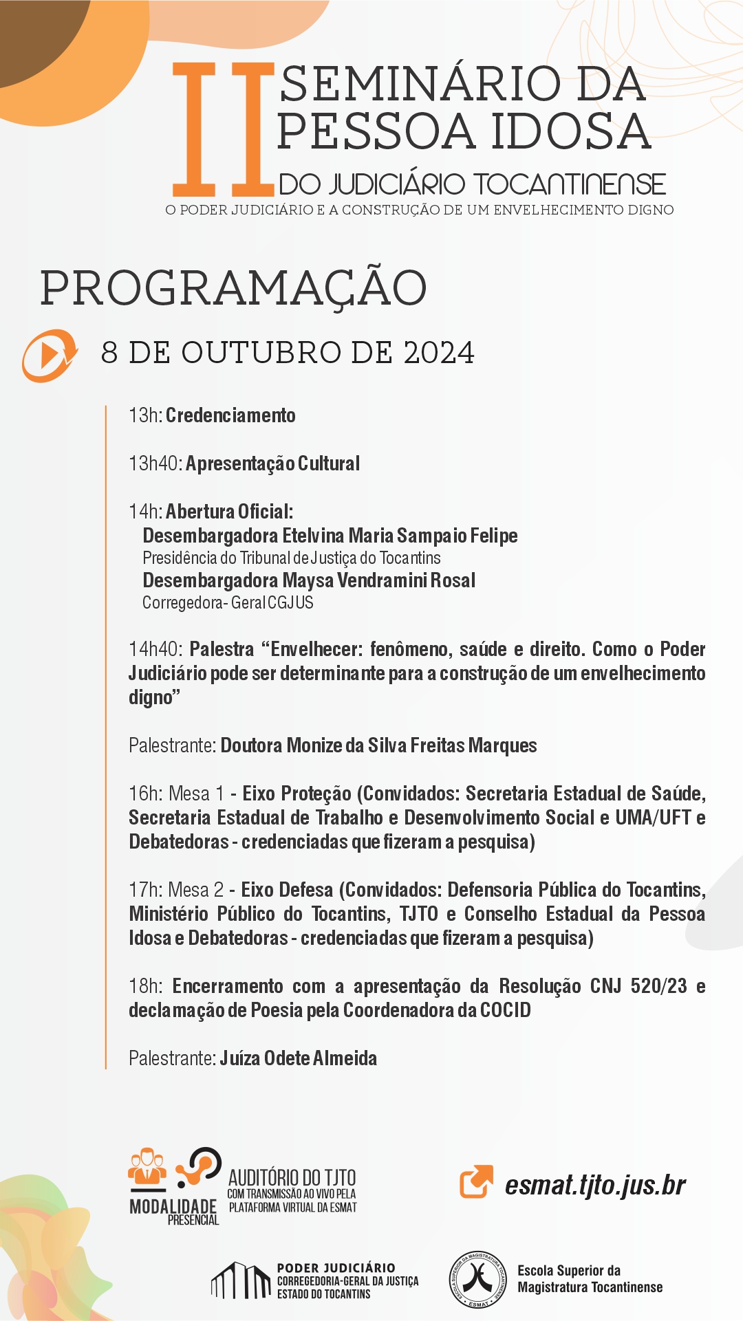 Registrations for the II Seminar on the Elderly in the Judiciary of the State of Tocantins has been extended until October 8th, the date on which the event will be held, offering yet another opportunity for all those interested to take part.