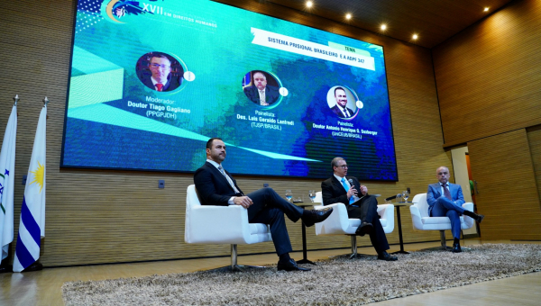 The Brazilian Prison System and the Argument for Failure to Comply with a Fundamental Precept (ADPF) 347 was the topic on the afternoon of the second day (October 3rd) of the XVII International Congress on Human Rights. The lecture featured Justice Luís Geraldo Lanfredi, from the Court of Justice of the State of São Paulo (TJSP), and Doctor Antônio Henrique Graciano Suxberger, coordinator of the Department for Monitoring and Inspection of the Prison System and Compliance with Socio-Educational Measures, to discuss the health of the Brazilian prison system, as well as the study of the application of fair sentences. The panel was mediated by Dr. Tiago Gagliano.