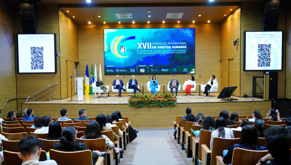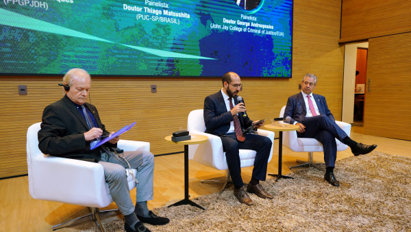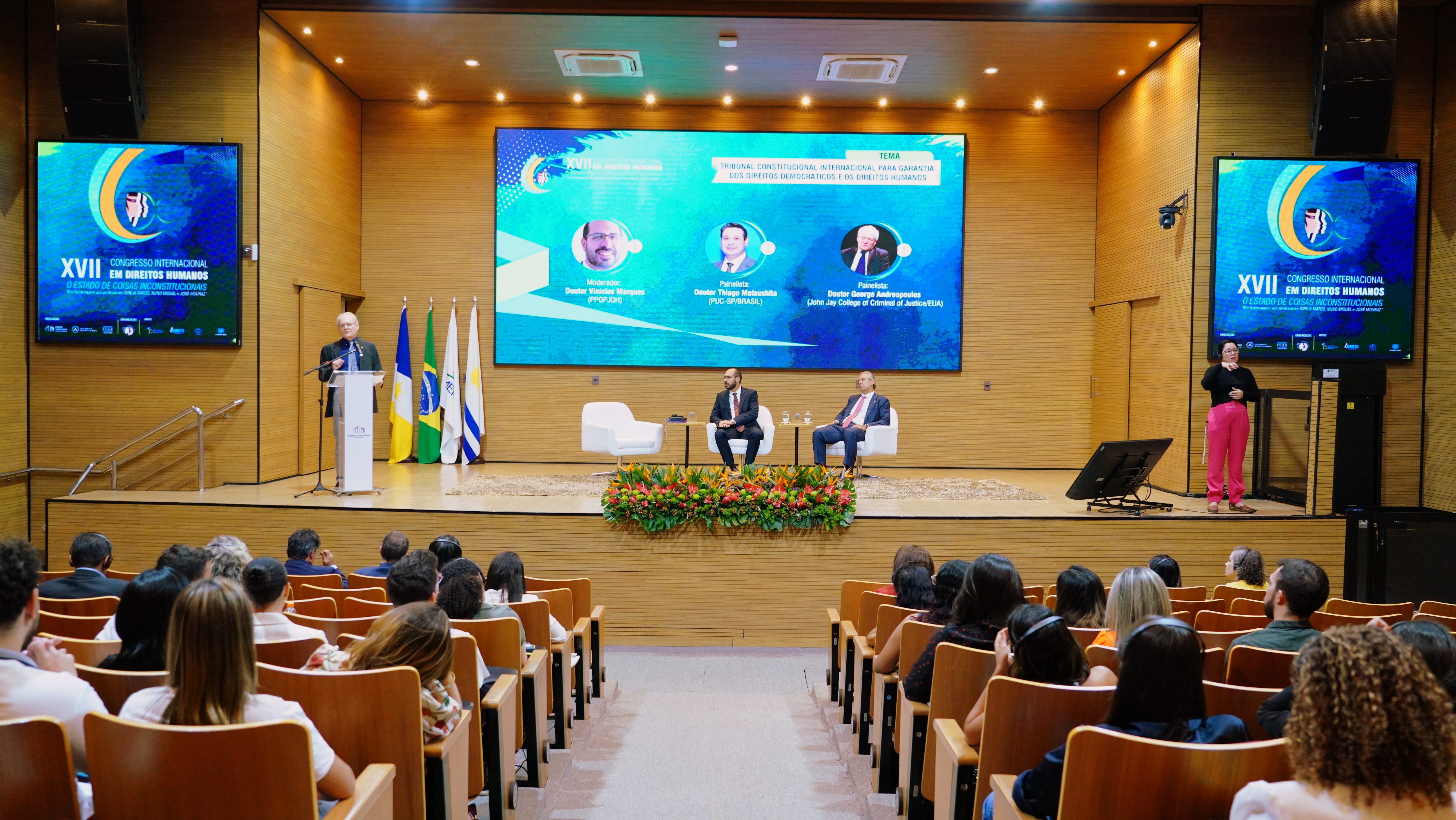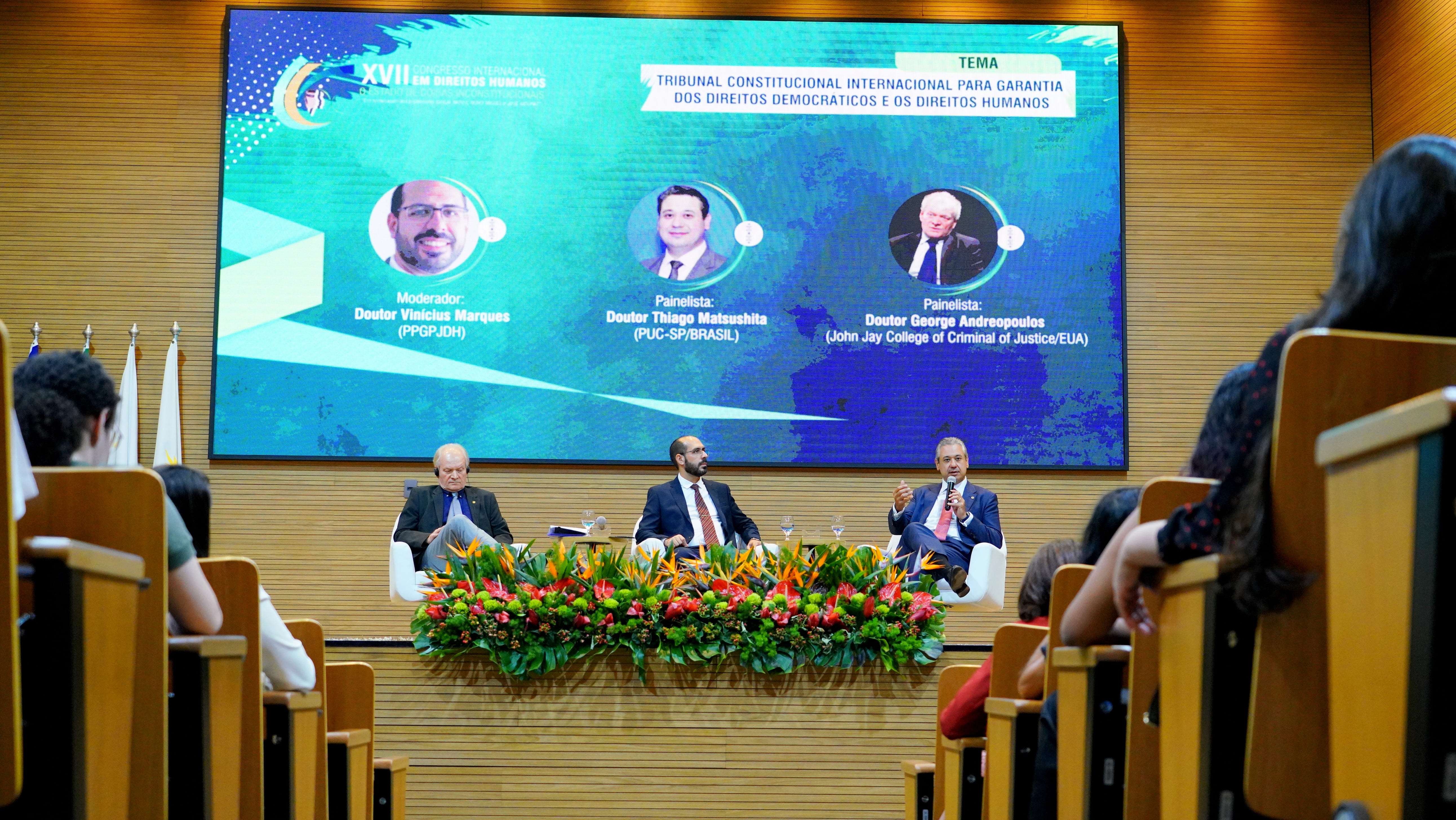 The panel on “Creation of an International Constitutional Court for the Guarantee of Democratic Rights and Human Rights” opened the Friday afternoon programming (October 4th) of the XVII International Congress on Human Rights. The debate featured Professor George Andreopoulos, from the John Jay College of Criminal Justice (USA), and Professor Thiago Matsushita, from the Pontifical Catholic University of the State of São Paulo (PUC-SP). Both brought important reflections on the challenges and urgency of creating an international court dedicated to the protection of human rights.
