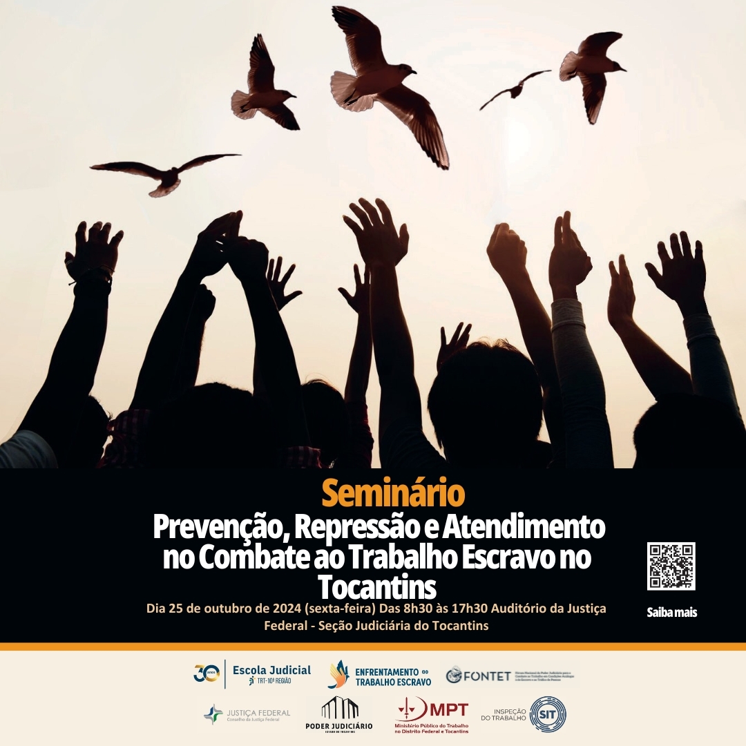 With the aim of reflecting on the eradication of contemporary slave labor in the State of Tocantins (TO), the Regional Labor Court of the 10th Region (TRT-10) will hold the Seminar on Prevention, Repression and Assistance in Combating Slave Labor in the State of Tocantins. The event will take place on October 25th (Friday), from 8:30 a.m. to 5 p.m., in the Auditorium of the Federal Justice - Judicial Section of TO, 201 North Block, Set 01, 02A, S/n - 103 North, in the city of Palmas.