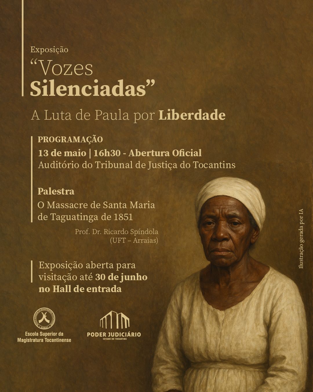Alluding to the date of the signing of the Golden Law, celebrated on May 13th, the Judiciary of the state of Tocantins, through the Permanent Commission for Memory Management (CGM) and the Superior School of the Judges of the State of Tocantins (Esmat), is holding the opening of the Silenced Voices exhibition next Tuesday at 4:30 p.m. in the auditorium of the Court of Justice of the State of Tocantins (TJTO): Struggle of Paula for freedom. The exhibition proposes an immersion in the history of slavery in the state of Tocantins, through the story of Paula, a black enslaved woman who won her freedom in 1858.
