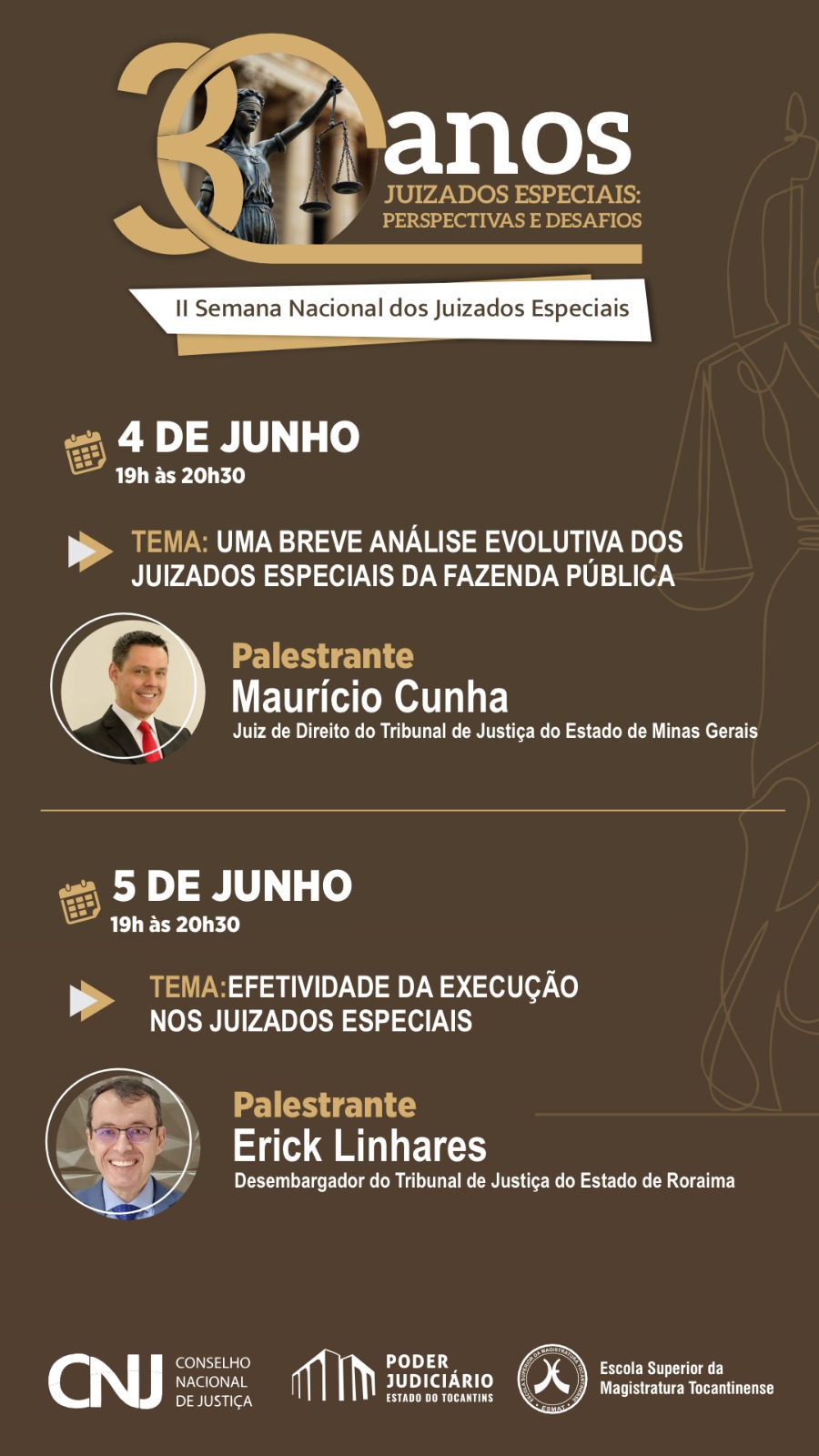 On Thursday (June 5th), the guest is Justice Erick Linhares, from the Court of Justice of the State of Roraima (TJRR), who will address the topic on “Effective Enforcement in the Special Courts”. Both conferences are coordinated by Judge Marcelo Augusto Ferrari Faccioni, from the TJTO.