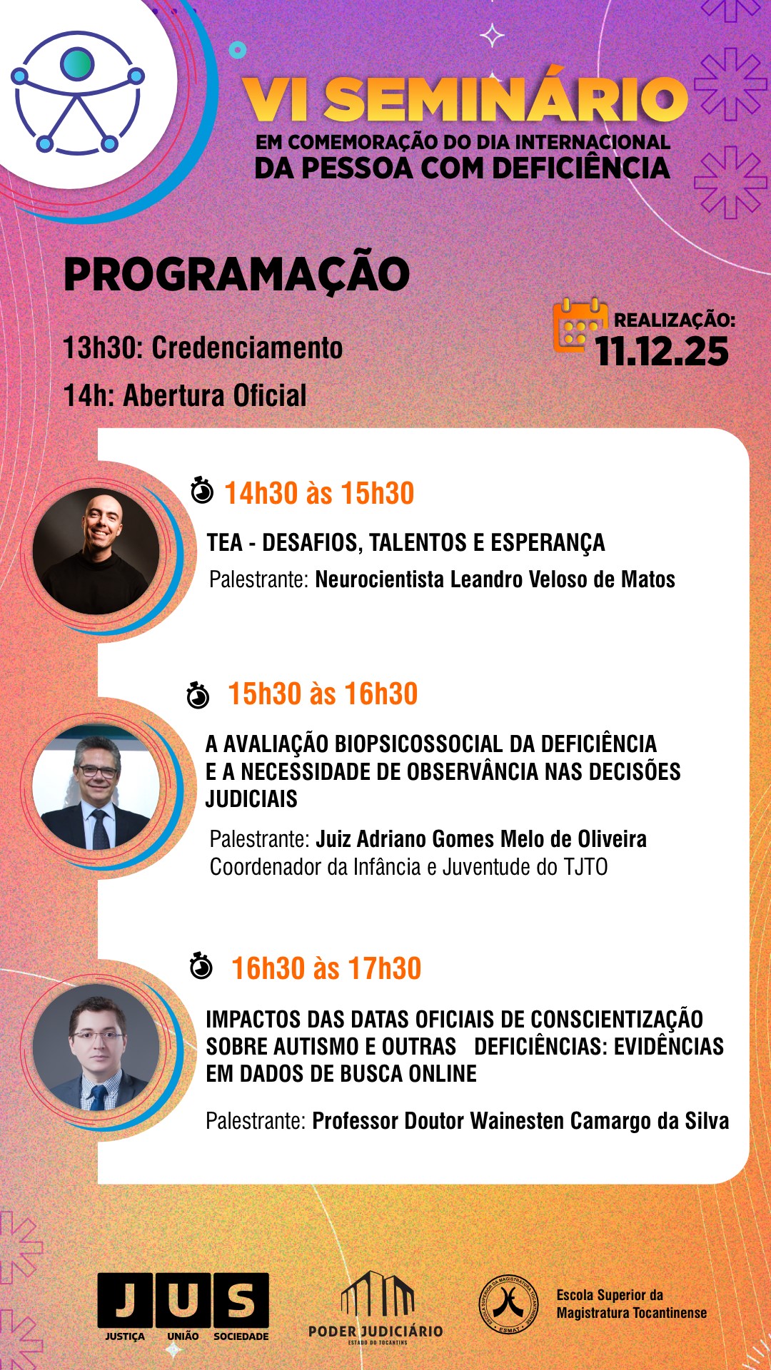 The Superior School of the Judges of the State of Tocantins (Esmat), in partnership with the Permanent Commission on Accessibility and Inclusion (CPAI), holds this Thursday (Dec 11th), from 2pm, the VI Seminar in Commemoration of the International Day of People with Disabilities, in the auditorium of the Court of Justice of the State of Tocantins (TJTO).