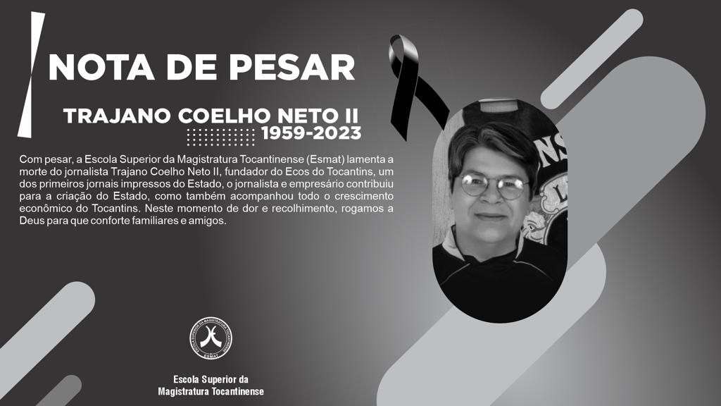 The Superior School of the Judges of the State of Tocantins (ESMAT) mourns the death of Journalist Trajano Coelho Neto II, founder of “Ecos do Tocantins” (Echoes of Tocantins), one of the first printed newspapers of the State. The journalist and businessman contributed to the creation of the State, as well as accompanying all of the economic growth of the State. In this moment of grief and recollection, we pray to God to comfort his family and friends.