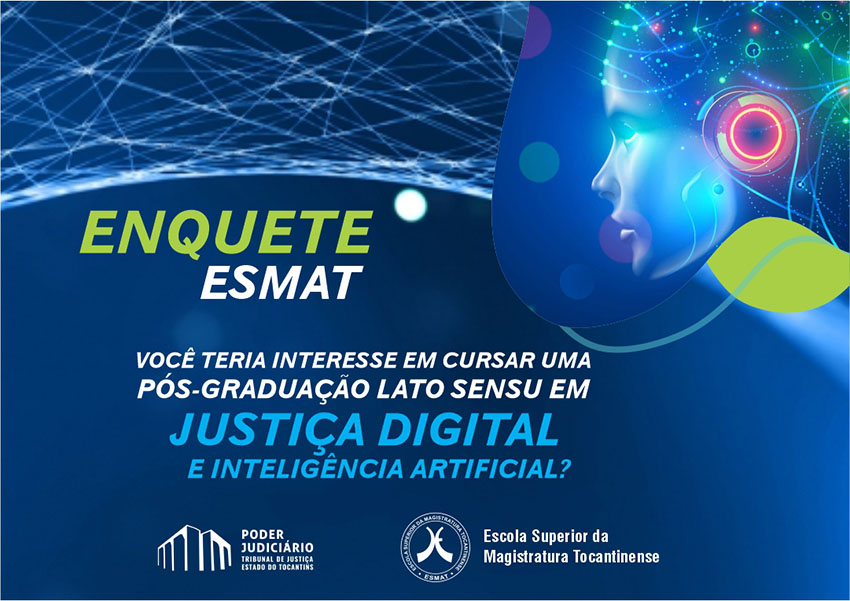 Contando com uma Pós-Graduação Lato Sensu em curso de Comunicação Jurídica Estratégica na Era Digital, a Escola Superior da Magistratura Tocantinense (ESMAT) está realizando uma enquete virtual em suas redes sociais para saber do seu público-alvo e estratégico a possibilidade de lançar, em 2022, uma Pós-Graduação em Justiça Digital e Inteligência Artificial.