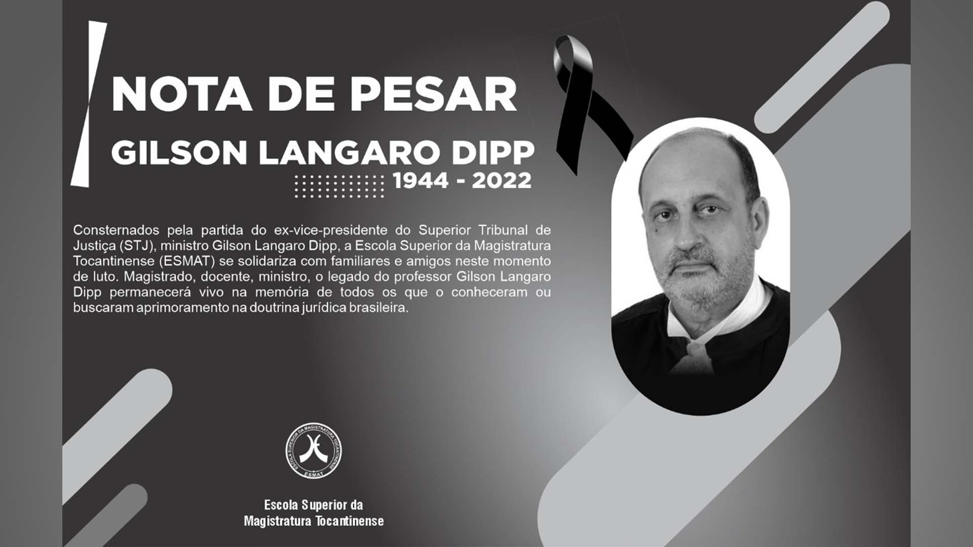 Consternados pela partida do ex-vice-presidente do Superior Tribunal de Justiça (STJ), ministro Gilson Langaro Dipp, a Escola Superior da Magistratura Tocantinense (ESMAT) se solidariza com familiares e amigos neste momento de luto. Magistrado, docente, ministro, o legado do professor Gilson Langaro Dipp permanecerá vivo na memória de todos os que o conheceram ou buscaram aprimoramento na doutrina jurídica brasileira.