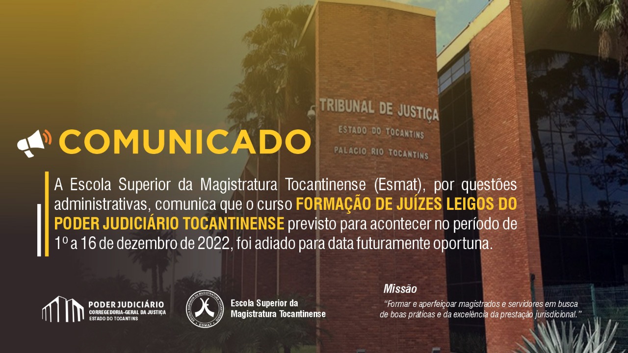 A Escola Superior da Magistratura Tocantinense (ESMAT), por questões administrativas, comunica que o curso FORMAÇÃO DE JUÍZES LEIGOS DO PODER JUDICIÁRIO TOCANTINENSE previsto para acontecer no período de 1º a 16 de dezembro de 2022, foi adiado para data futuramente oportuna.