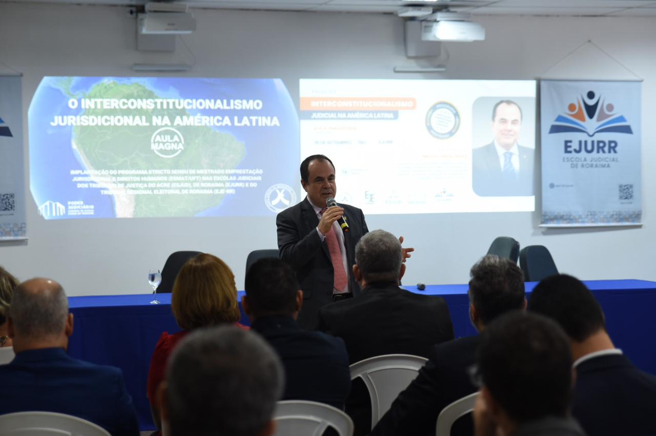 Em sua palestra, o desembargador explorou o Interconstitucionalismo Judicial na América Latina, contextualizando sua evolução, os principais dispositivos e os desafios em relação à Convenção Americana de Direitos Humanos.