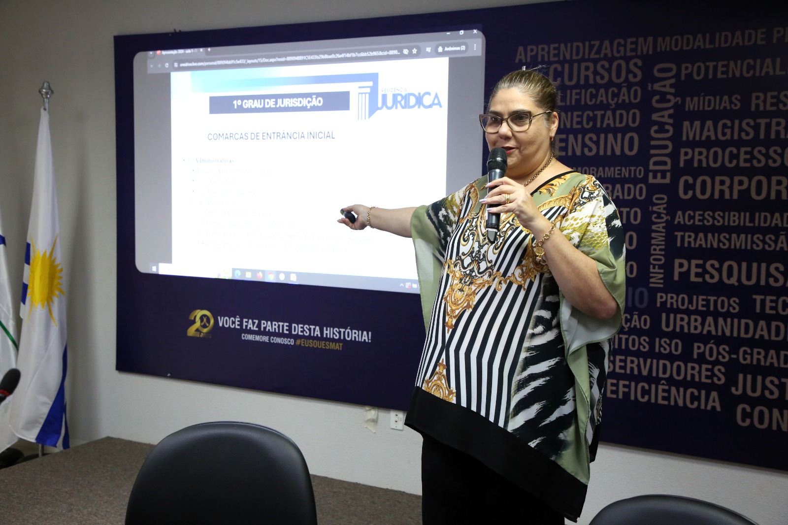 Neste segundo dia de atividades, a diretora do Fórum de Palmas, juíza Flávia Bovo, apresentou informações importantes sobre a organização interna do Poder Judiciário do Estado do Tocantins e sua atuação como instituição.