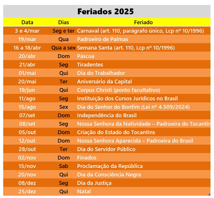 Por meio da Portaria nº 3383/2024, publicada em 25 de novembro, o Tribunal de Justiça do Tocantins (TJTO) definiu o calendário de feriados e pontos facultativos para o Poder Judiciário do Tocantins em 2025.